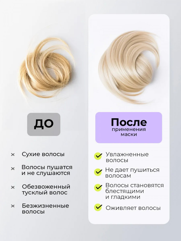 При нанесении хватает небольшого количества, использовать можно раз в неделю, с термошапкой на минут 15-20 раз в полтора месяца. Непослушные питающиеся и вьющиеся волосы легко расчёсывать.