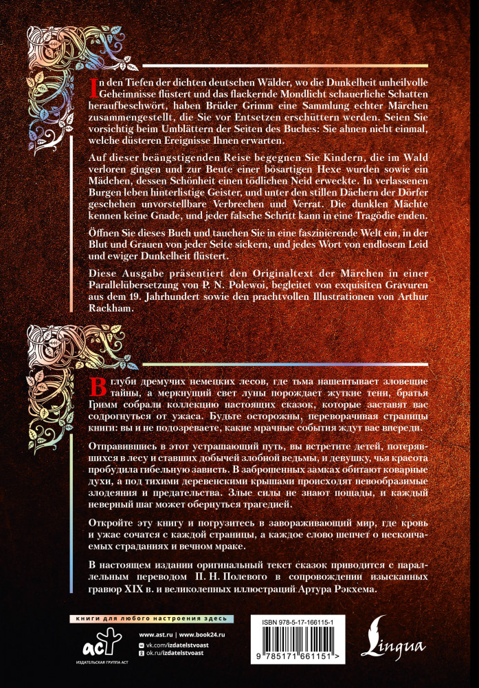 💳 Оплатить за товар можно при получении 🇰🇿 Есть бесплатная доставка по Казахстану от 1 дня 🎁 Копите бонусы с каждой покупки Серия: Bilingua подарочная: иллюстрированная книга на языке оригинала с переводом В глуби дремучих немецких лесов, где тьма нашептывает зловещие тайны, а меркнущий свет луны порождает жуткие тени, братья Гримм собрали коллекцию настоящих сказок, которые заставят вас содрогнуться от ужаса. Будьте осторожны, переворачивая страницы книги: вы и не подозреваете, какие мрачные события ждут вас впереди. В этом сборнике перед вами предстанут не добрые сказки, а пугающие истории о злобных ведьмах, коварных духах, древних проклятиях и невообразимых злодеяниях. Откройте эту книгу и погрузитесь в завораживающий мир, где кровь и ужас сочатся с каждой страницы, а каждое слово шепчет о нескончаемых страданиях и вечном мраке. |