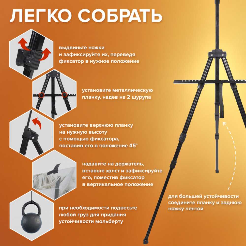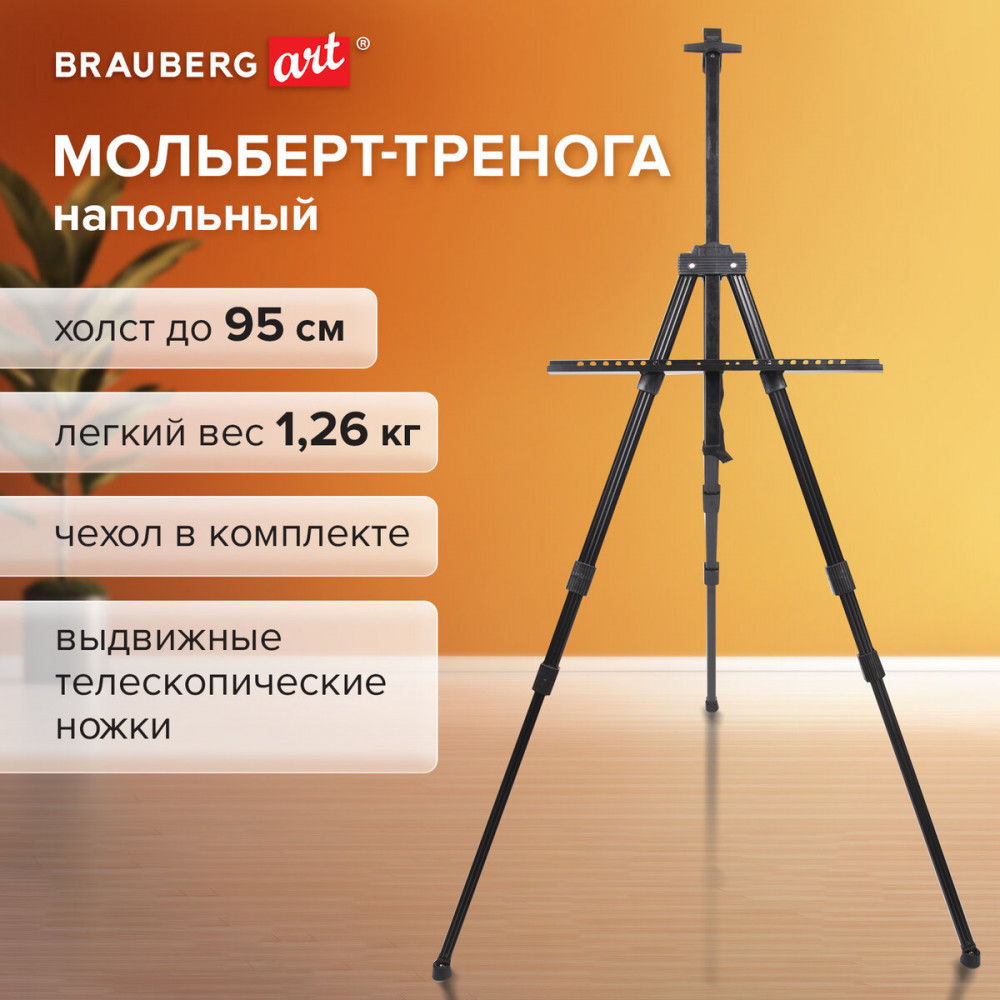 💳 Оплатить за товар можно при получении 🇰🇿 Есть бесплатная доставка по Казахстану от 1 дня 🎁 Копите бонусы с каждой покупки Серия: Art Classic Мольберт Brauberg Art «Classic» отлично подойдет тем, кто ищет многофункциональную модель, которую можно использовать как дома, так и за его пределами. Оснащен держателем для кистей и специальной лентой, на которую можно подвесить груз для придания устойчивости. Выдвижные ножки оснащены зажимами-клипсами, как у современных фотоштативов, благодаря чему установка мольберта производится очень быстро. Выполнен из высококачественного алюминия черного цвета — устойчивого к коррозии металла, который обеспечивает легкость и прочность изделия. Максимальная высота размещаемого холста — 95 см. |