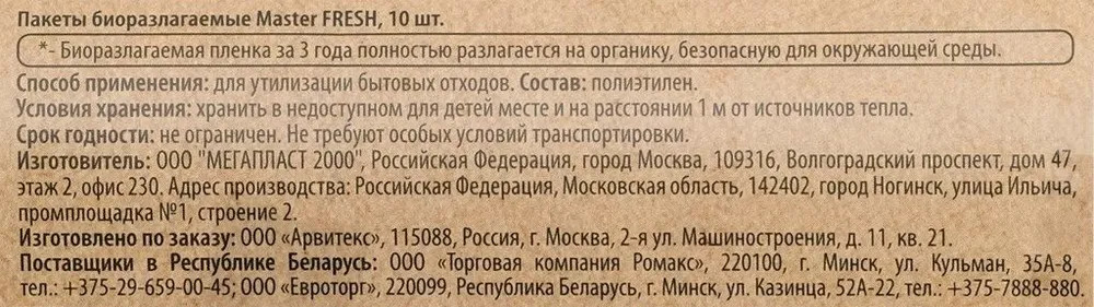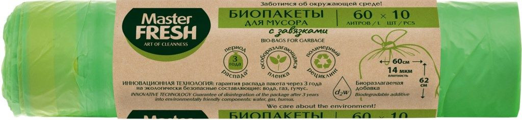 💳 Оплатить за товар можно при получении 🇰🇿 Есть бесплатная доставка по Казахстану от 1 дня 🎁 Копите бонусы с каждой покупки Серия: Био Master Fresh биопакеты для мусора изготовлены с добавлением биоразлагаемой добавки d2W, которая встраивается в структуру полиэтилена, разрушает молекулярную решетку полиэтиленовой пленки. Поэтому пакет разлагается гораздо быстрее. Гарантия распада биопакета Master Fresh через 3 года на экологически безопасные составляющие: вода, газ, гумус. Биоразлагаемая пленка Master Fresh за 3 года полностью разлагается на органику безопасную для окружающей среды. |
