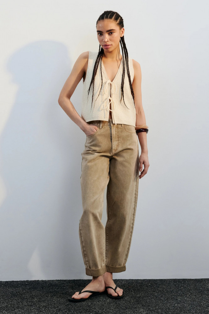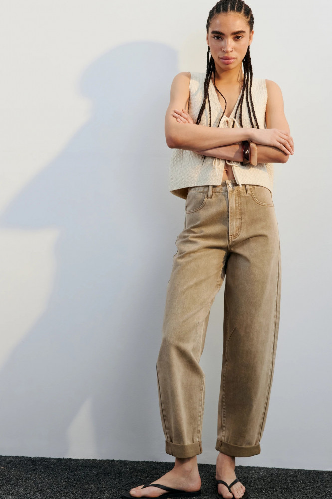 - Широкие женские джинсы-бананы из качественного, мягкого 100% хлопкового денима, который не линяет и не теряет форму после стирки - Укороченные штанины с подворотами, свободные в бедрах и зауженные книзу, с декоративными швами на коленях. Высокая посадка по талии, подчеркивающая фигуру и скрывающая недостатки. Застежка на молнию и пуговицу спереди, шлевки для ремня. Два боковых кармана с отрезным бочком, два задних накладных кармана - Трендовые широкие джинсы barrel fit для расслабленных повседневных и уличных луков, которые никогда не выйдут из моды и станут идеальной основой твоего гардероба на каждый день. Сочетай их с любым верхом и создавай самые комфортные аутфиты на теплое время года. Стильные широкие джинсы-бананы в бежевом цвете с актуальным вареным эффектом идеально подойдут как для офиса или учебы, так и для прогулок, поездок за город и просто на каждый день