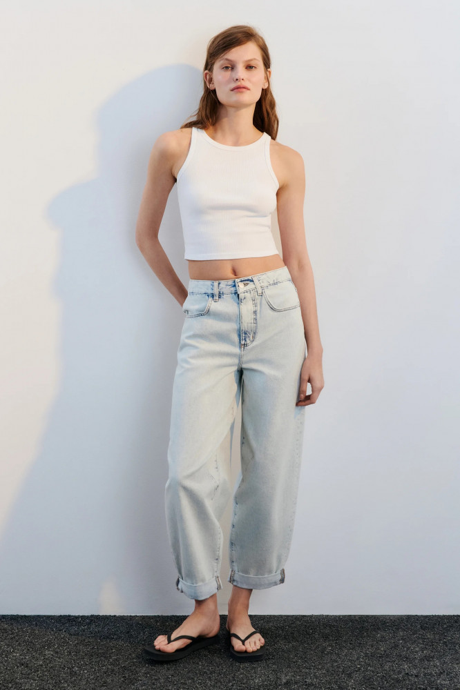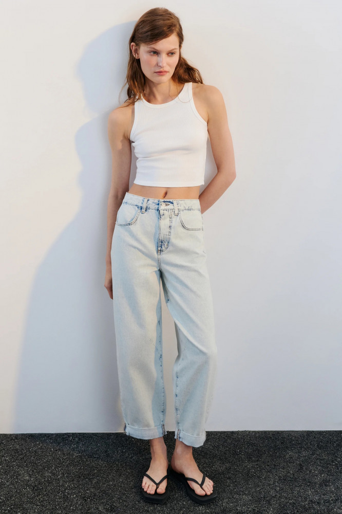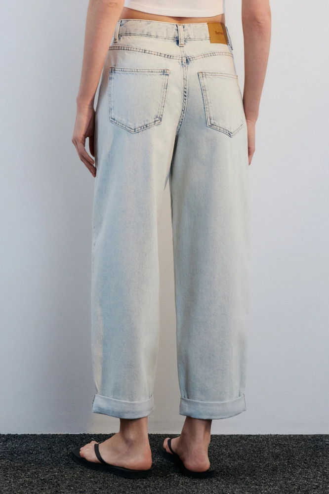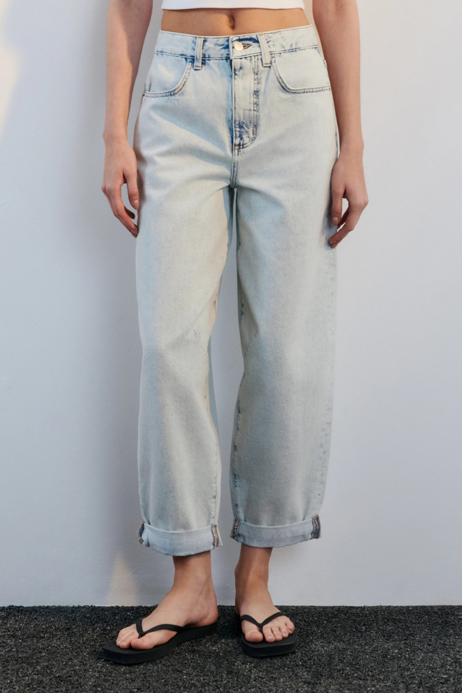 - Широкие женские джинсы-бананы из качественного, мягкого 100% хлопкового денима, который не линяет и не теряет форму после стирки - Укороченные штанины с подворотами, свободные в бедрах и зауженные книзу, с декоративными швами на коленях. Высокая посадка по талии, подчеркивающая фигуру и скрывающая недостатки. Застежка на молнию и пуговицу спереди, шлевки для ремня. Два боковых кармана с отрезным бочком, два задних накладных кармана - Трендовые широкие джинсы barrel fit для расслабленных повседневных и уличных луков, которые никогда не выйдут из моды и станут идеальной основой твоего гардероба на каждый день. Сочетай их с любым верхом и создавай самые комфортные аутфиты на теплое время года. Стильные широкие джинсы-бананы в светлом оттенке с актуальным вареным эффектом идеально подойдут как для офиса или учебы, так и для прогулок, поездок за город и просто на каждый день