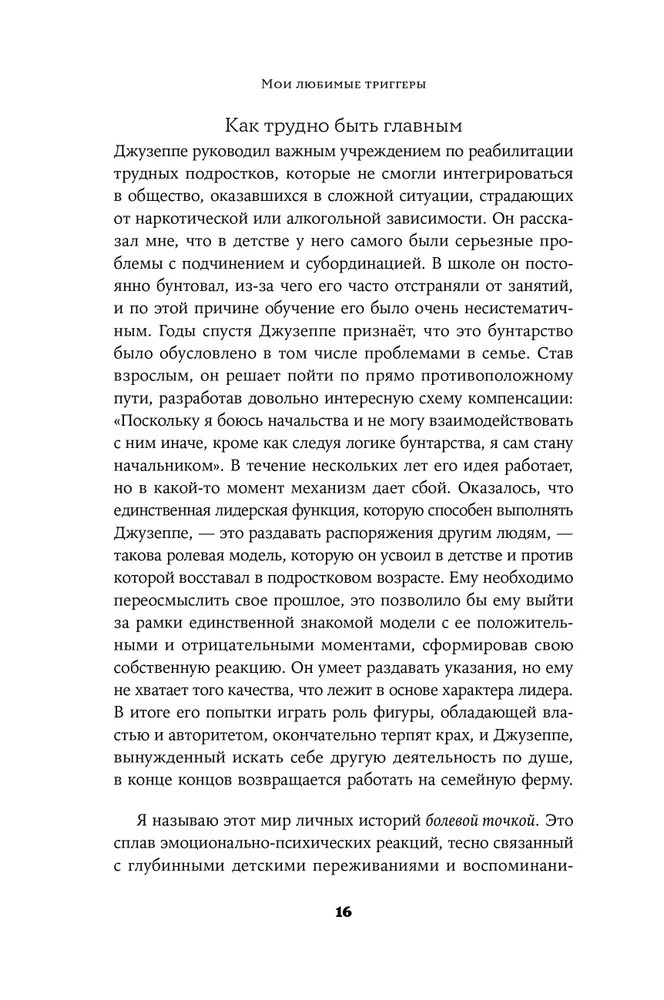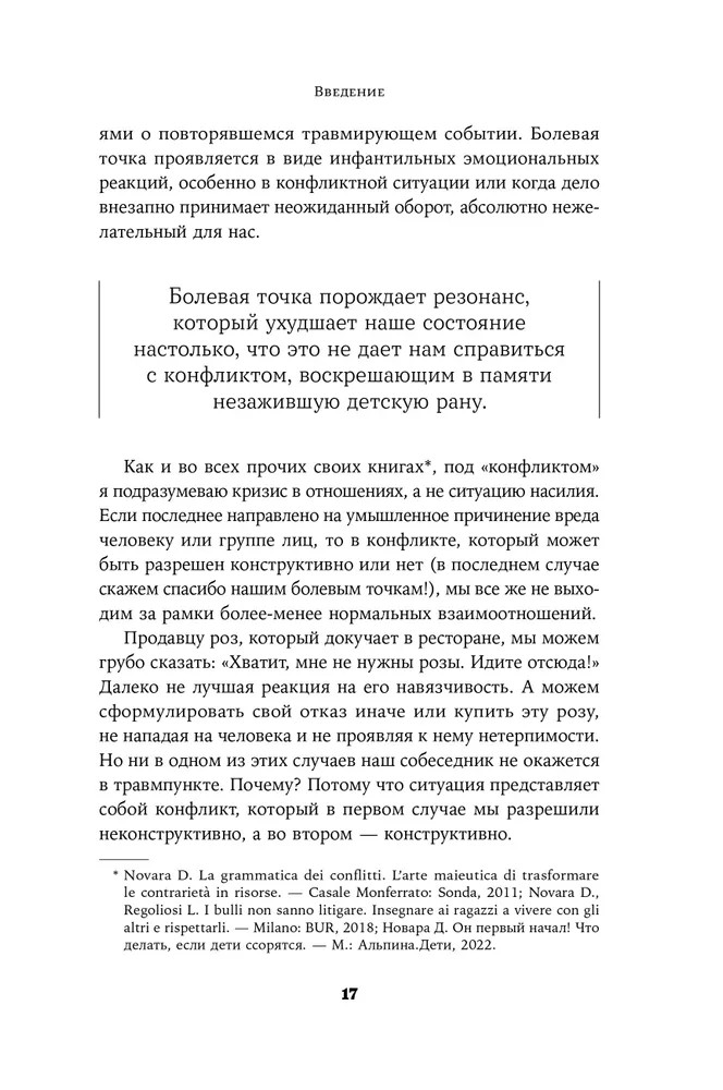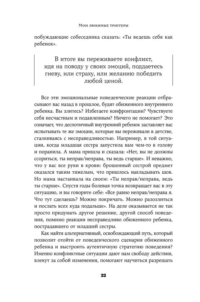Серия: Альпина: психология и философия Триггер — это наша болевая точка: вроде бы безобидное действие или фраза, которые причиняют нам боль, оглушают, лишают сил или провоцируют на бурную реакцию. Триггеры возникают, когда конфликтная ситуация или неосторожное слово постороннего человека, коллеги или близкого задевают самые глубокие слои нашей памяти о незаживших детских травмах. И тогда мы внезапно теряем здравомыслие, плачем, замыкаемся в себе или устраиваем скандал. В своей работе Даниэле Новара — опытный психолог и педагог, автор книг «Наказания бесполезны!», «Не кричите на детей!» и других бестселлеров, рассказывает о том, как возникают триггеры и как их заблаговременно распознавать, а также делится авторской методикой эффективного разрешения конфликтов. Его книга поможет читателям жить в гармонии с собой и научит бережно и эффективно взаимодействовать с другими людьми. |