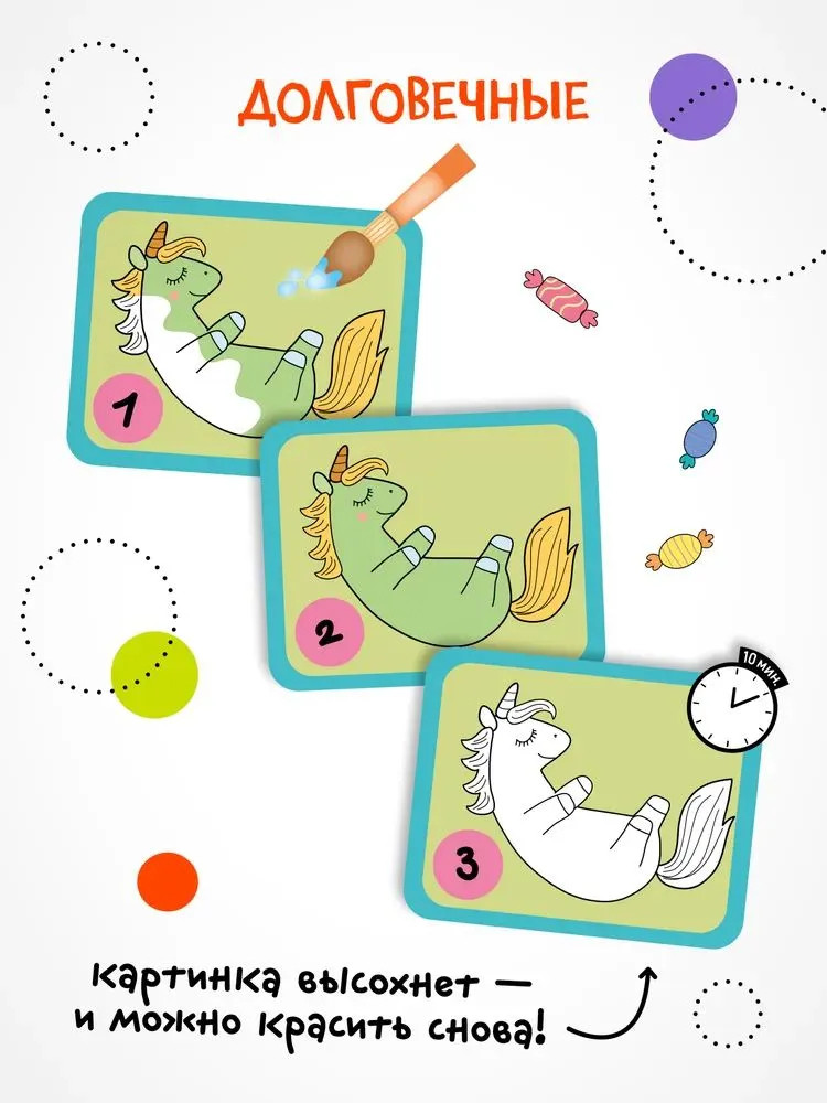💳 Оплатить за товар можно при получении 🇰🇿 Есть бесплатная доставка по Казахстану от 1 дня 🎁 Копите бонусы с каждой покупки Серия: Многоразовые водные раскраски Книга «Единороги» серии «Многоразовые водные раскраски» — это настоящая находка для юных художников! Странички для раскрашивания сделаны из картона и покрыты специальной краской. При контакте с водой она становится прозрачной, а рисунок — цветным! Стоит лишь провести мокрой кисточкой — и происходит настоящее волшебство. Где отдыхают единороги и феи? А какие вкусности им нравятся? Забавные рисунки точно понравятся ребенку, а сам процесс раскрашивания — не только увлекательное, но и полезное занятие для развития воображения, внимательности и мелкой моторики. |
