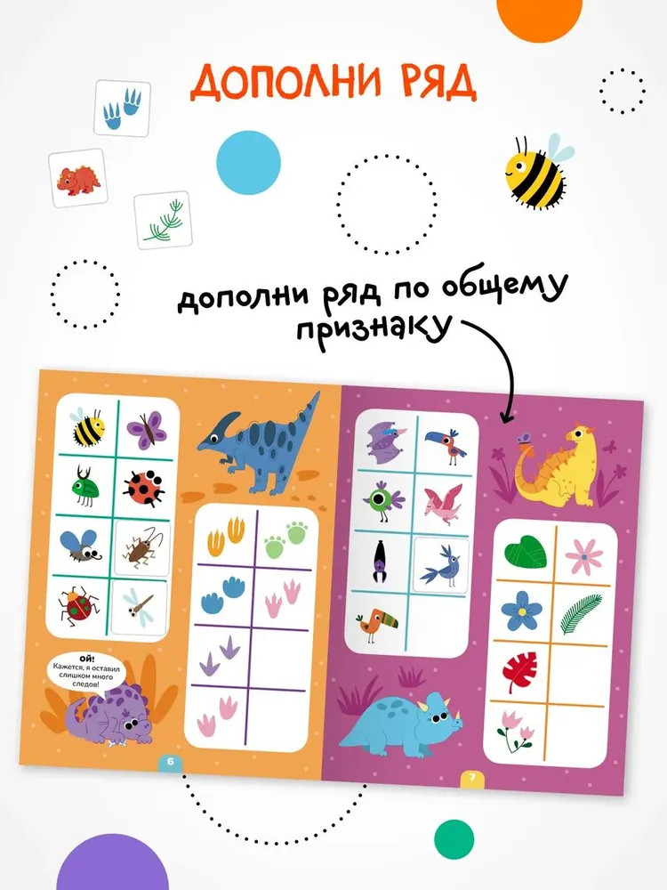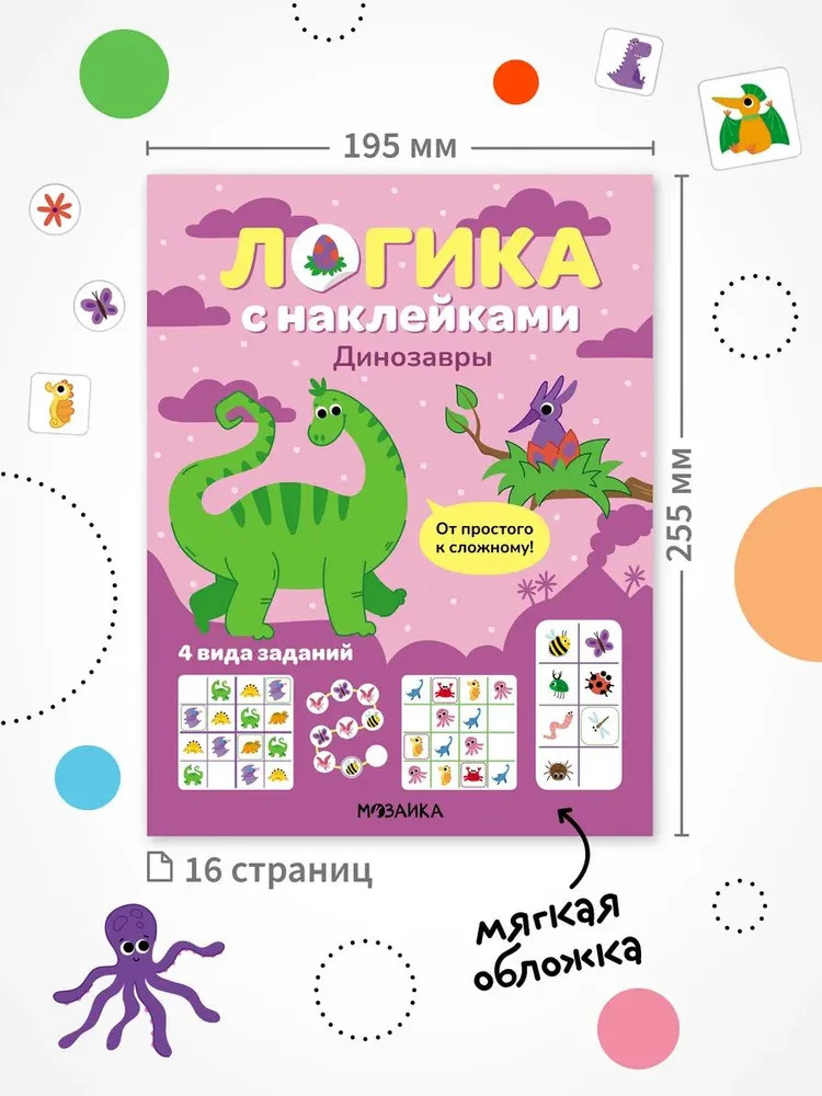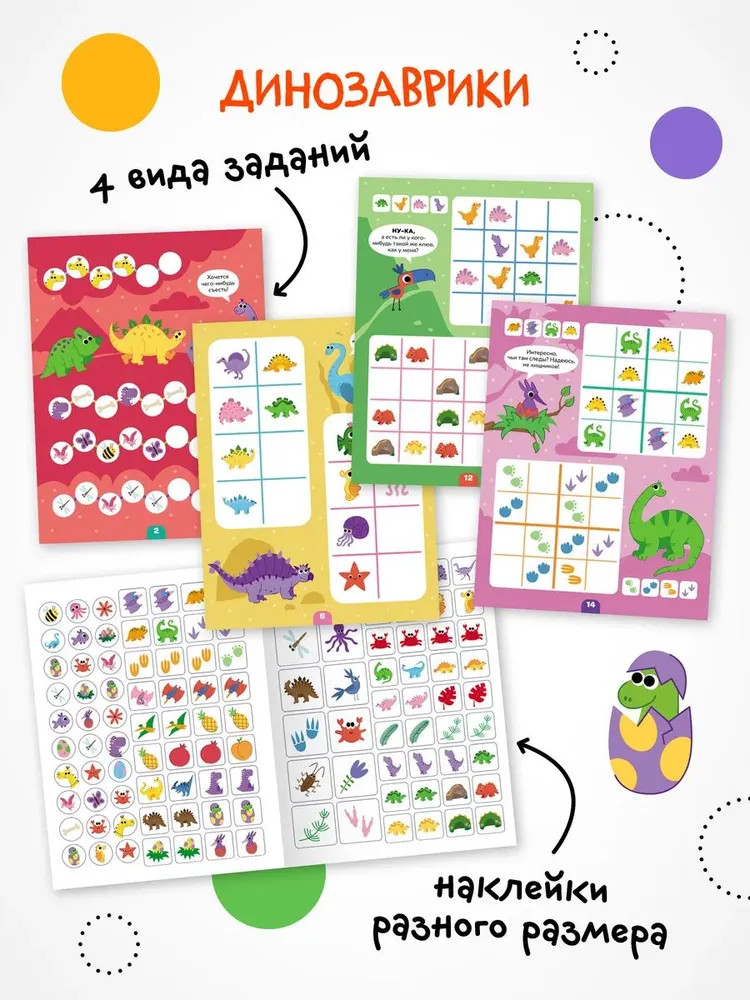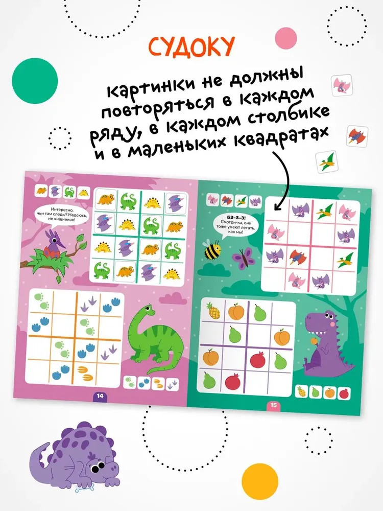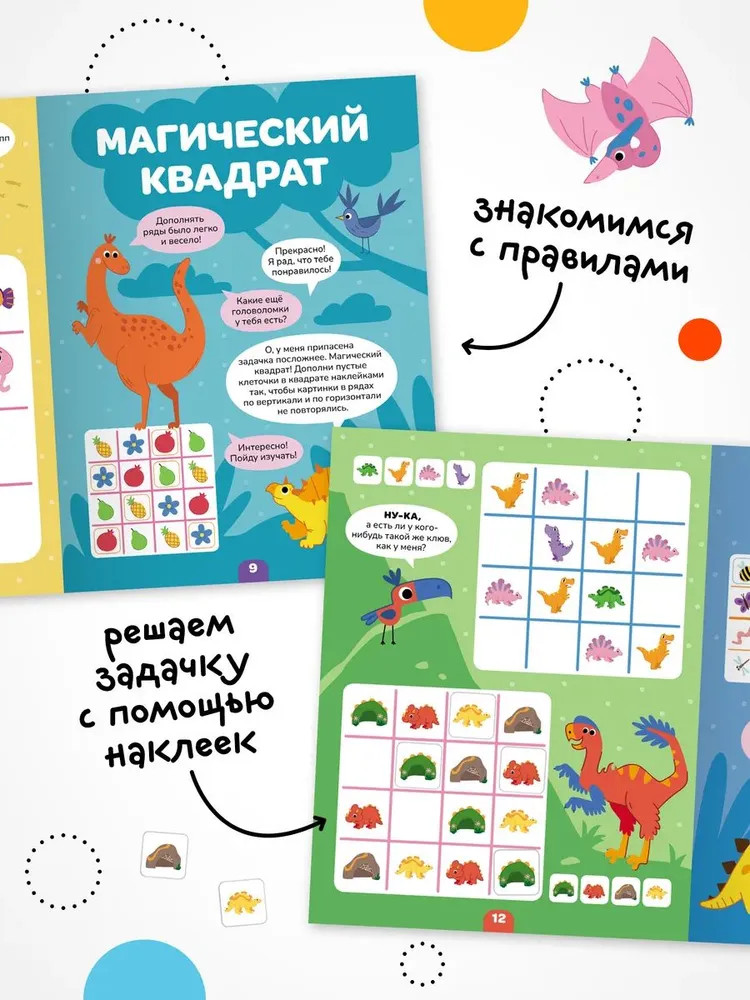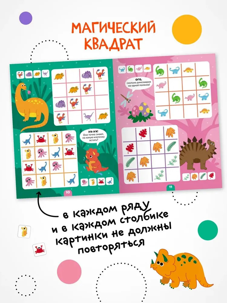 Серия: Логика с наклейками Книга «Динозавры» серии «Логика с наклейками» поможет ребенку весело и с пользой провести время, расширить кругозор, потренировать память и логическое мышление. Любимый вид деятельности практически каждого ребенка — клеить наклейки — мы совместили с решением популярных заданий на логику. В каждой книжке четыре вида логических задачек — продолжи ряд, дополни ряд, магический квадрат и судоку. И на каждой страничке ребенка ждут обаятельные динозаврики! Задания адаптированы для детей от 4 лет и расположены от простого к сложному. Для детей помладше может понадобиться помощь взрослого, но начиная с 5 лет ребята уже вполне смогут справиться с заданиями самостоятельно. |