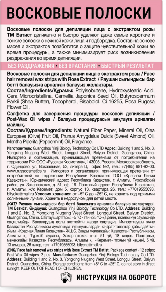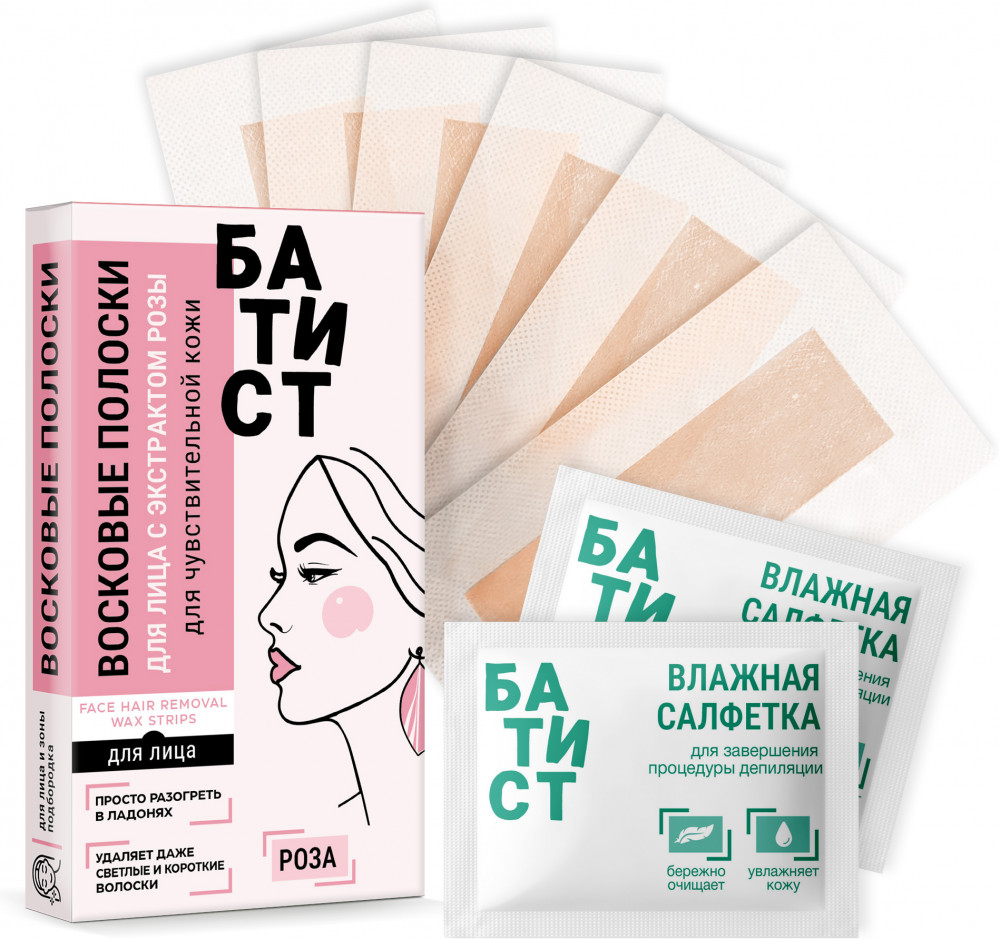 Батист Восковые полоски для депиляции чувствительной кожи лица с экстрактом розы-20% +53