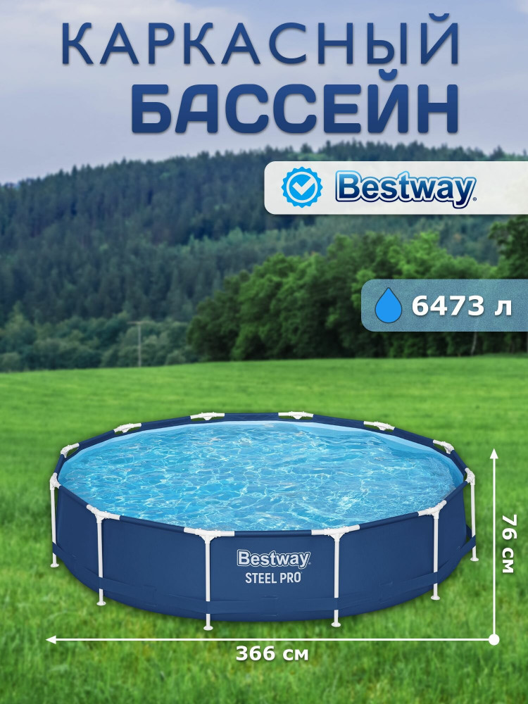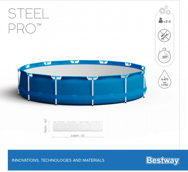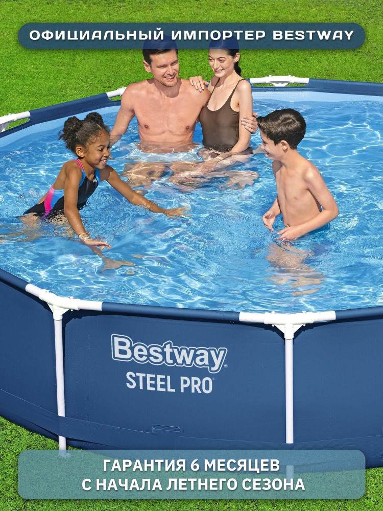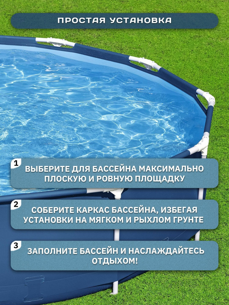 Каркасный бассейн Bestway 56706 отличается высокой прочностью и устойчивостью. Чаша выполнена из высококачественного трехслойного ПВХ: два слоя плотного винила и между ними сетка из полиэстера для особой прочности. Цвет чаши бассейна снаружи синий. Каркас металлический, покрытый предотвращающим появление коррозии слоем пластика. Не требует бетонирования и подготовки ямы, все, что нужно, это плоская, горизонтальная площадка. Сезонный бассейн (рекомендуется разбирать на холодное время года) обладает простой конструкцией — может быть легко разобран и собран заново. Время сборки и подключения бассейна составляет около 20 мин. Удобный сливной клапан позволяет присоединить садовый шланг, что дает возможность слить воду в любое место.