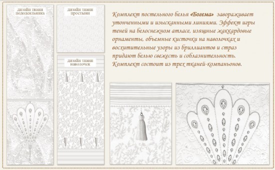 • использование трех тканей компаньонов в рисунках Богема, Прима и Визави: для пододеяльника, простыни и наволочек;