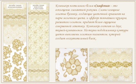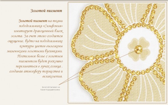 Цвет в реальности ближе к бежевому (как на втором фото), а не к желтому, но смотрится это даже хорошо, более элегантно. Качество ткани хорошее - плотная, но не тяжелая. Спать на таком белье приятно, да и выглядит красиво. Реклама не врет! Единственно, что золота нет, но оно здесь совсем ни к чему. Довольна и товаром и обслуживанием.
