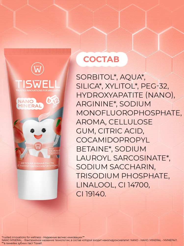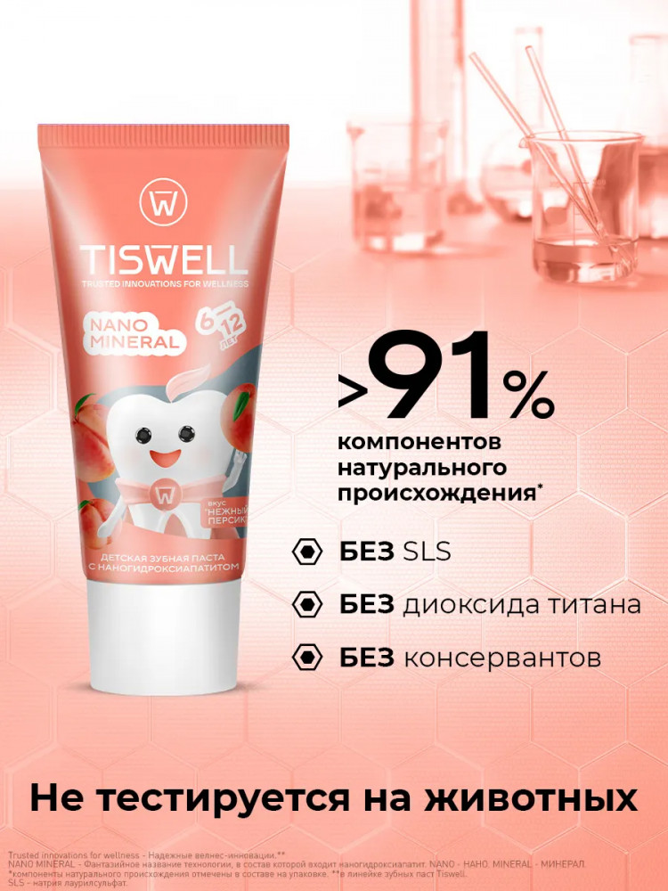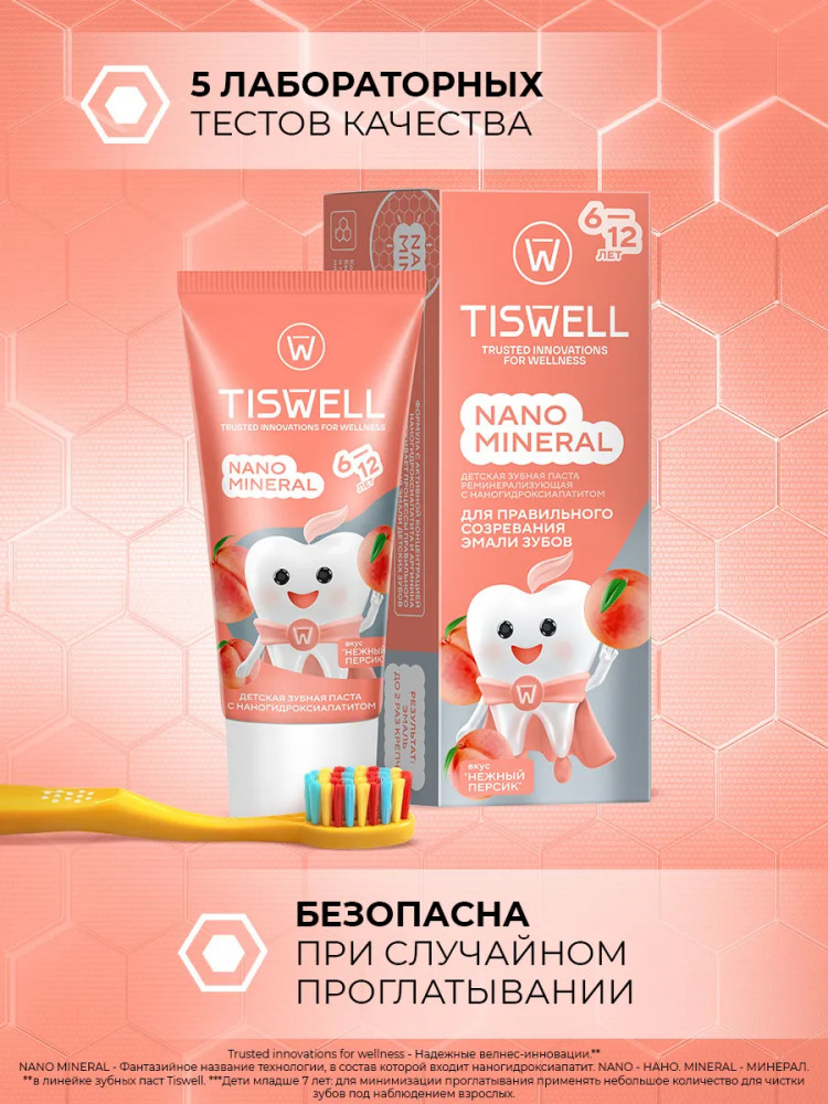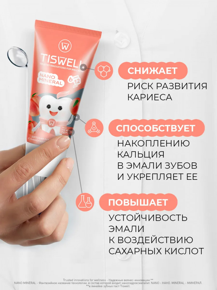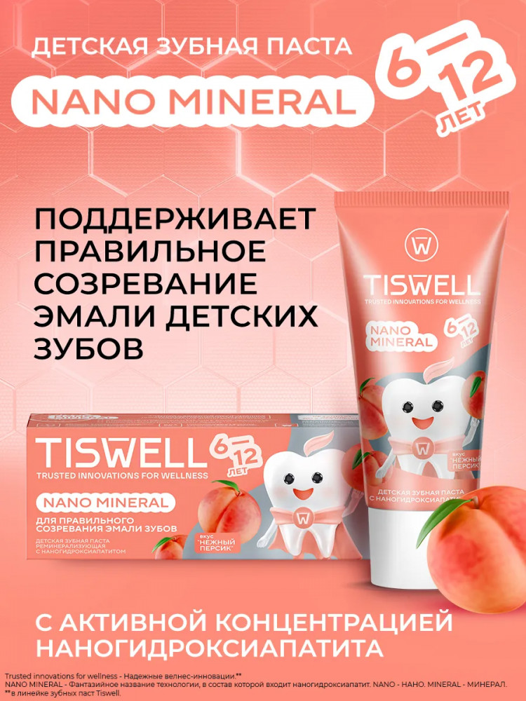 Tiswell Зубная паста детская реминерализующая с наногидроксиапатитом и фтором «Нежный персик»