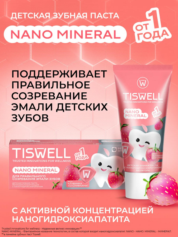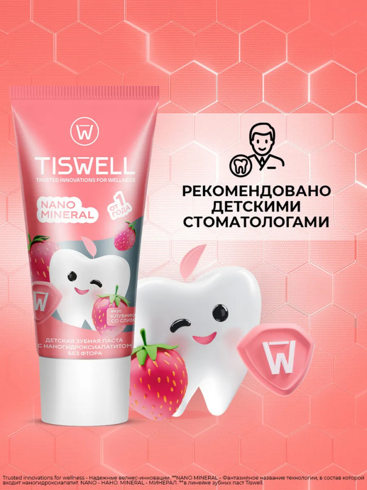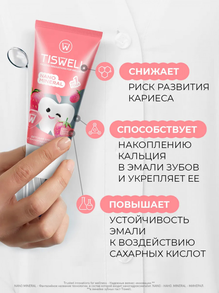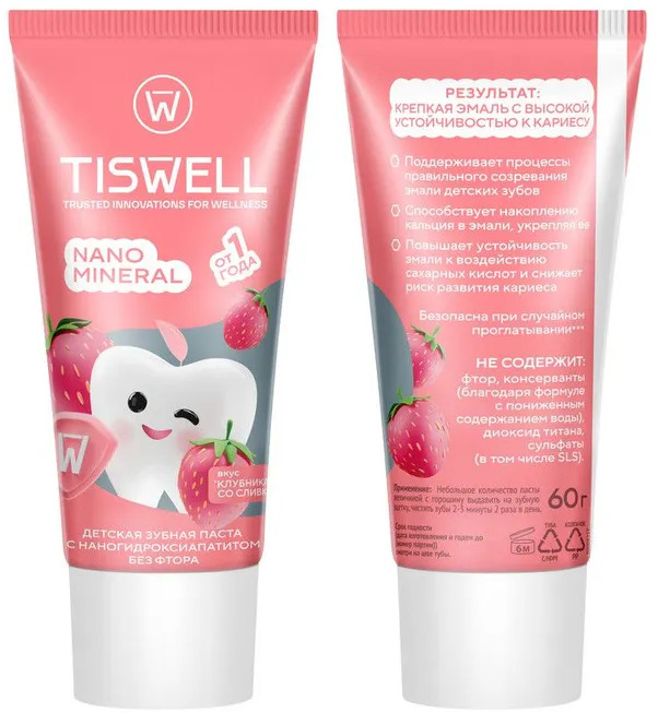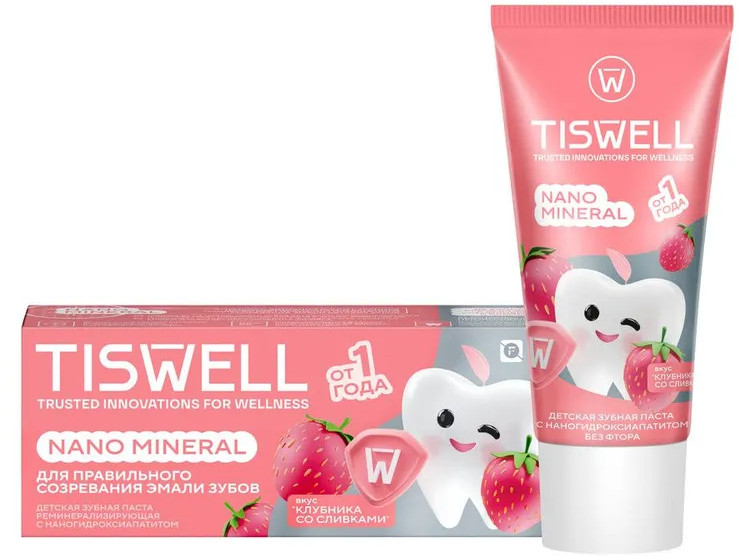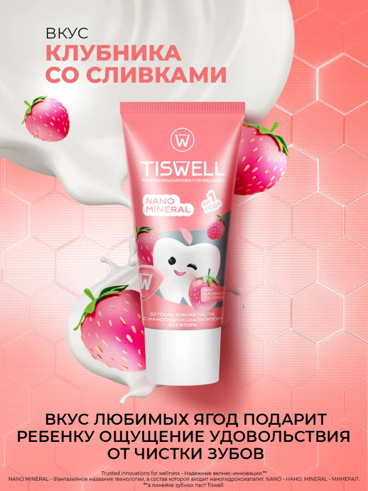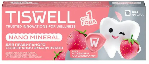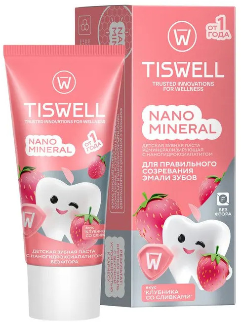 Tiswell Зубная паста детская реминерализующая с наногидроксиапатитом без фтора «Клубника со сливками»