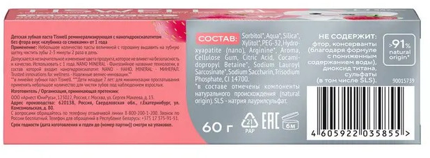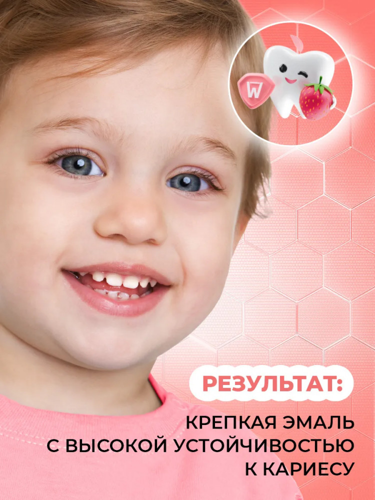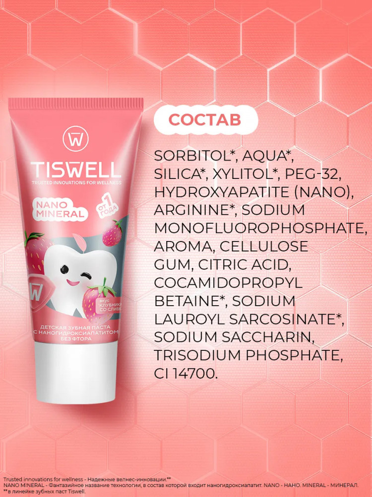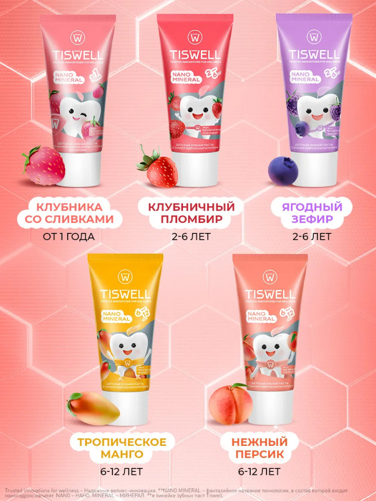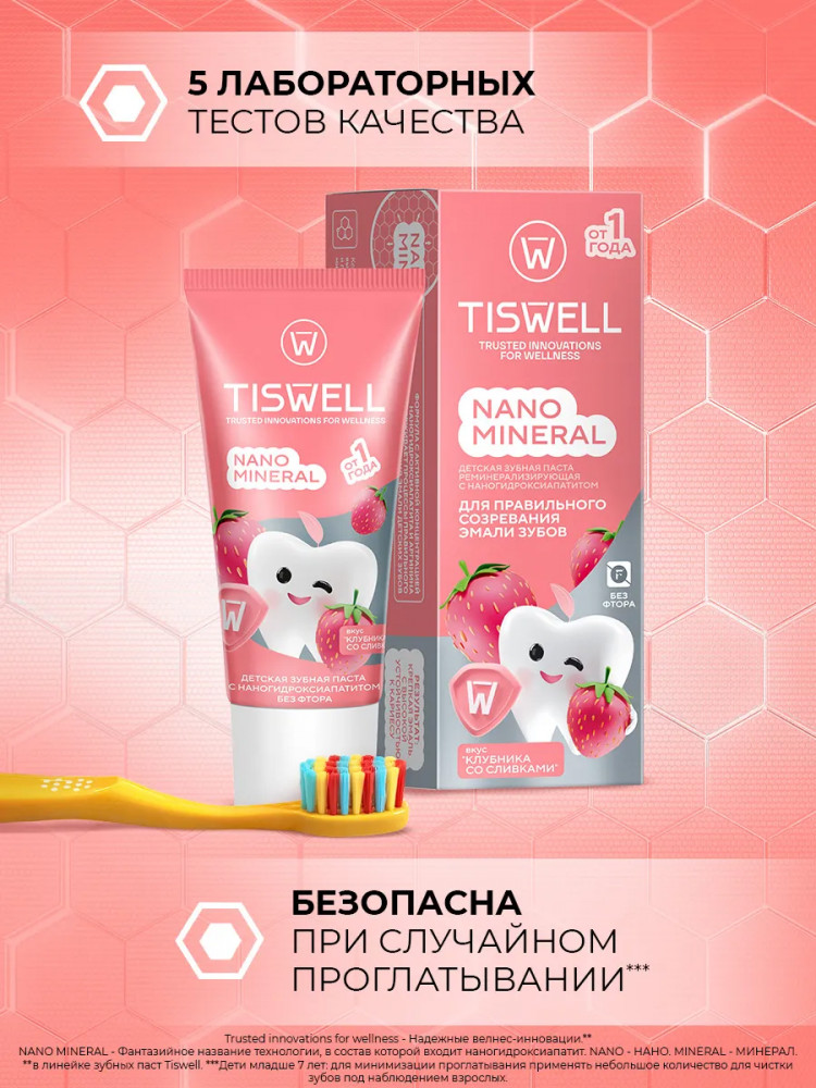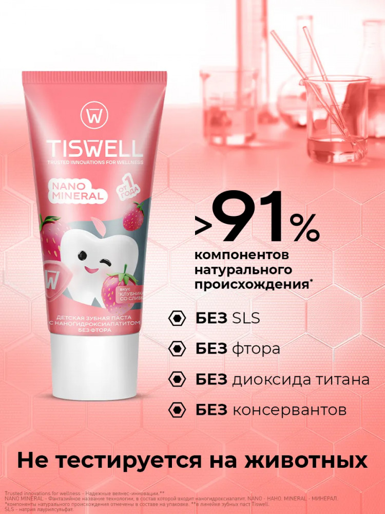 Tiswell Зубная паста детская реминерализующая с наногидроксиапатитом без фтора «Клубника со сливками»