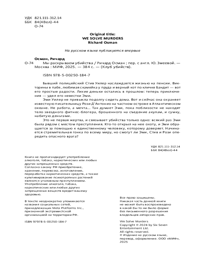 💳 Оплатить за товар можно при получении 🇰🇿 Есть бесплатная доставка по Казахстану от 1 дня 🎁 Копите бонусы с каждой покупки Серия: Клуб убийств Бывший полицейский Стив Уилер наслаждается жизнью на пенсии. Викторины в пабе, любимая скамейка у пруда и верный кот по кличке Бандит — вот его простые радости. Лихие деньки остались в прошлом: теперь приключения — удел его невестки Эми. Эми Уилер не привыкла подолгу сидеть дома. Вот и сейчас она охраняет известную писательницу Рози Д’Антонио на частном острове в Атлантическом океане. Не работа, а мечта... Так думает Эми, пока поблизости не находят тело звездного фитнес-блогера, брошенного на съедение акулам, и сумку, набитую деньгами. |
