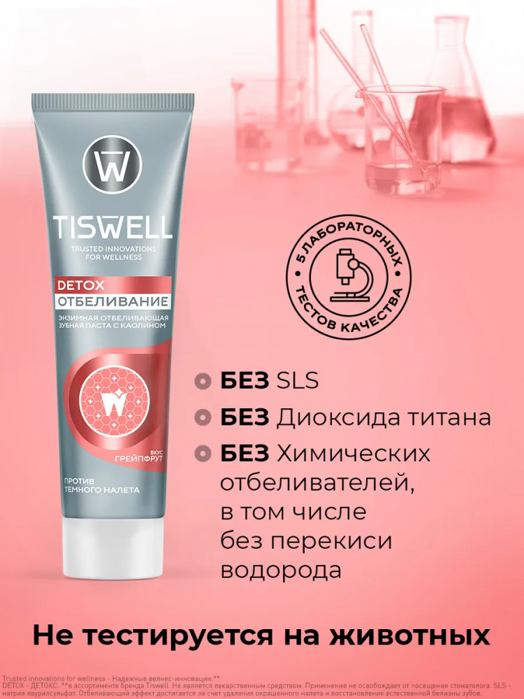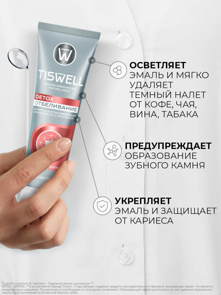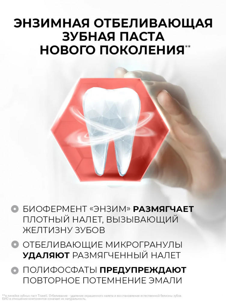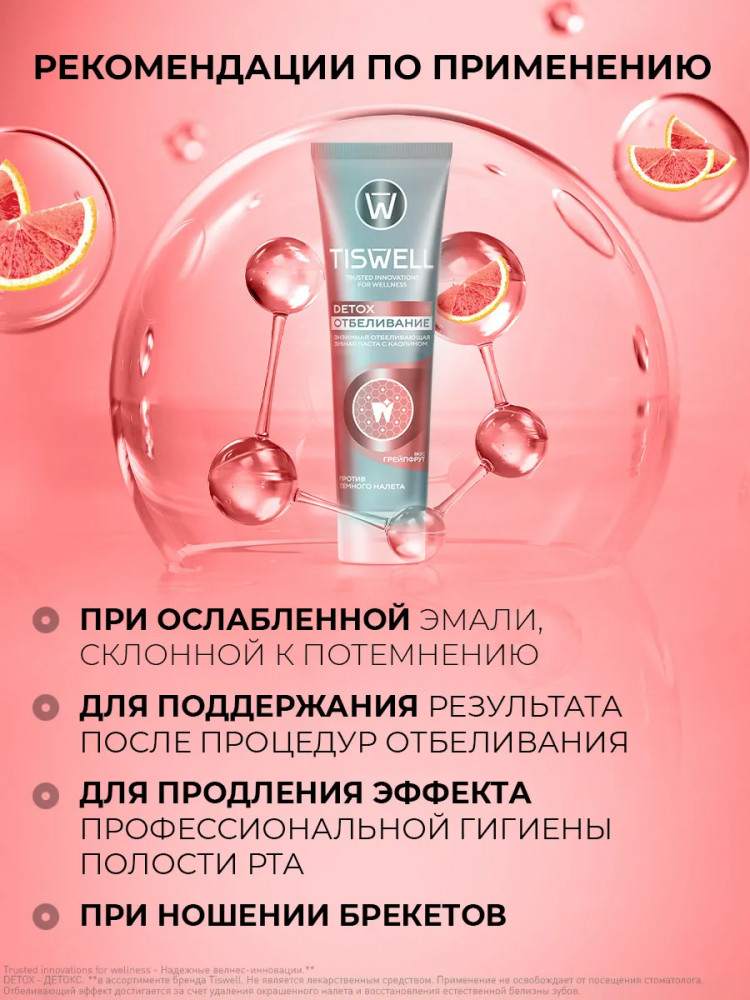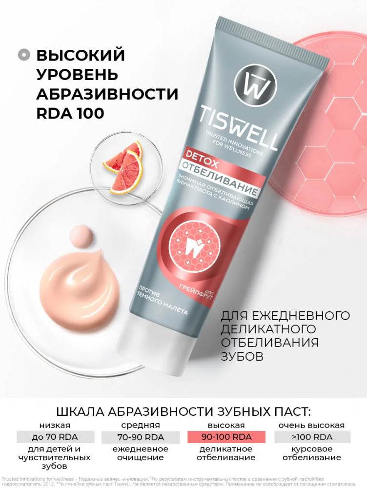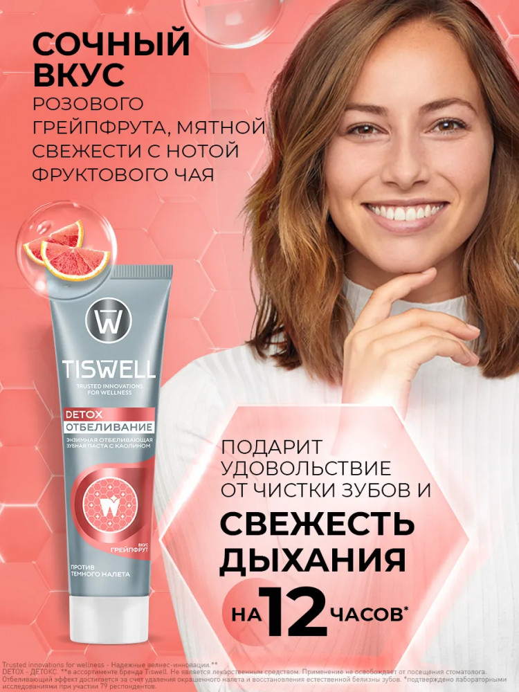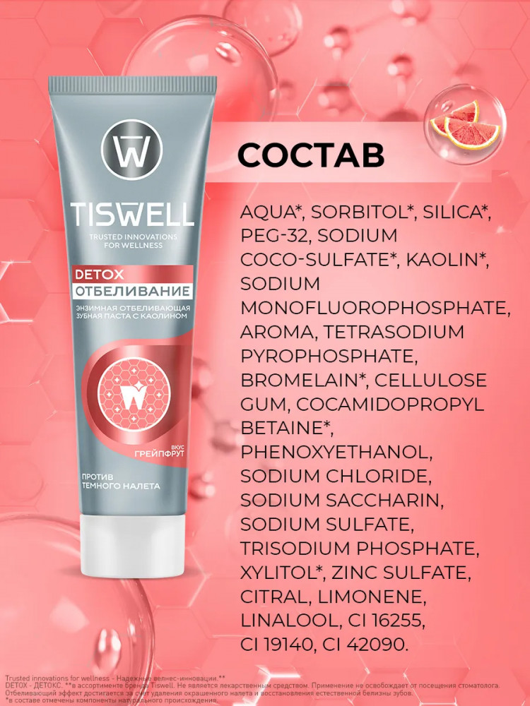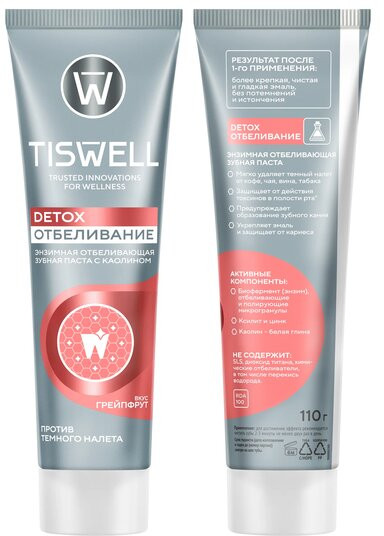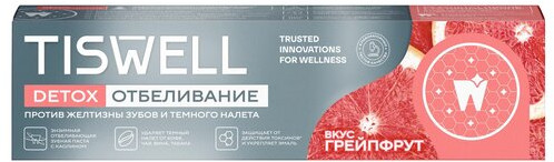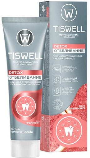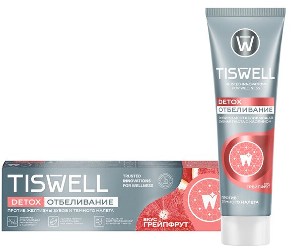 Tiswell Зубная паста отбеливающая энзимная от темного налета и камня с каолином и фтором «Грейпфрут»