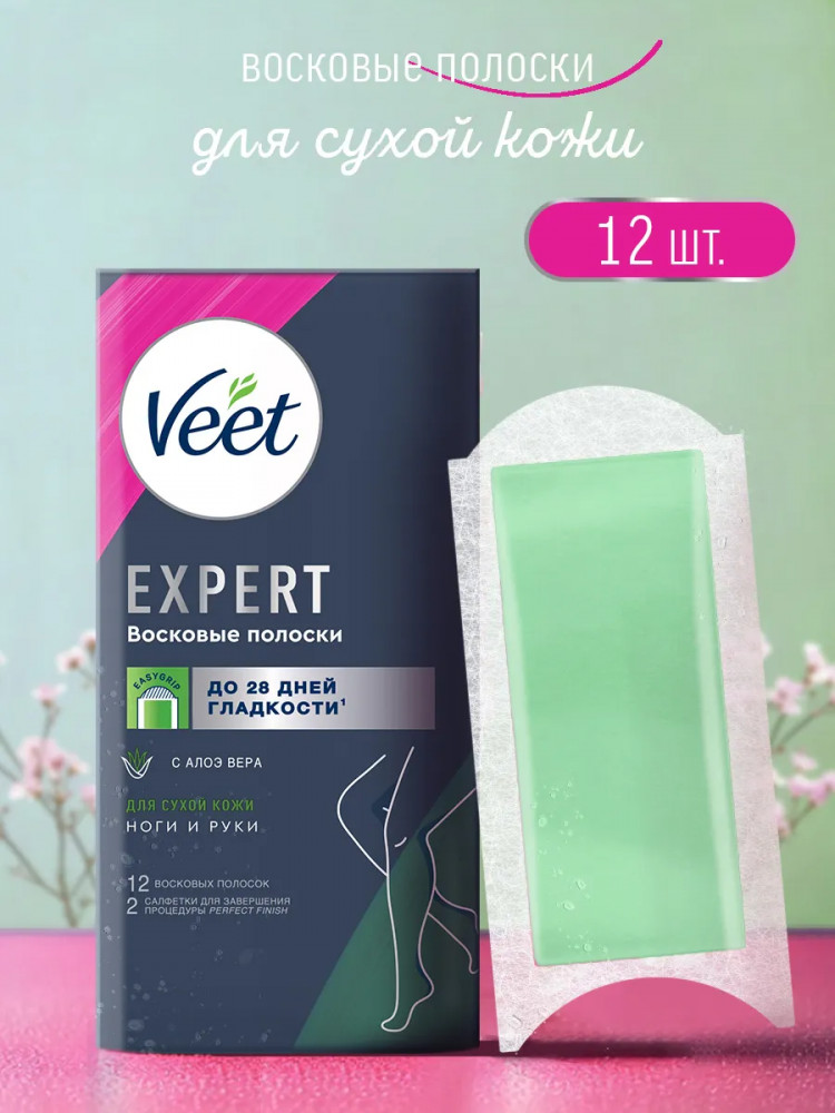 Серия: Expert Восковые полоски для депиляции Veet Expert для сухой кожи, 12 полосок для депиляции = 6 сдвоенных полосок. Разработанная экспертами уникальная форма полоски для депиляции EasyGrip* поможет вам удалить даже очень короткие волоски** с первого применения. Специальная формула с алоэ вера, известным своим благоприятным воздействием на сухую кожу, помогает отшелушивать её и сохранять гладкость до 28 дней***. Для идеального завершения процедуры воспользуйтесь новой салфеткой с маслами арганы и рыжика для дополнительного ухода за вашей кожей. Восковые полоски для депиляции можно использовать для удаления волос на ногах, руках, в области подмышек, линии бикини и над губой. Новые видео-инструкции помогут вам усовершенствовать технику депиляции воском: большинство опрошенных потребительниц подтвердили, что использование видео помогло достичь профессионального результата**** (сканируй QR-код на упаковке). Дерматологически протестированы.