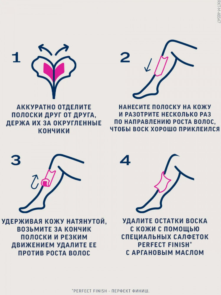 Полоски можно использовать для удаления волос на ногах, руках, в области подмышек, линии бикини и над губой. Не предназначены для применения на груди и в паховой области. Не используйте на родинках и рубцовых изменениях кожи, при угревой сыпи, при раздражении кожи или при солнечных ожогах, а также при любых иных нарушениях целостности кожных покровов, при варикозе вен, а также при наличии в прошлом негативной реакции на депиляцию воском. Если вы принимаете какие-либо лекарства, которые могут повлиять на кожу, или если у вас есть какие-либо проблемы с кожей, проконсультируйтесь у врача перед депиляцией. Депиляция воском не рекомендована пожилым людям и больным диабетом.