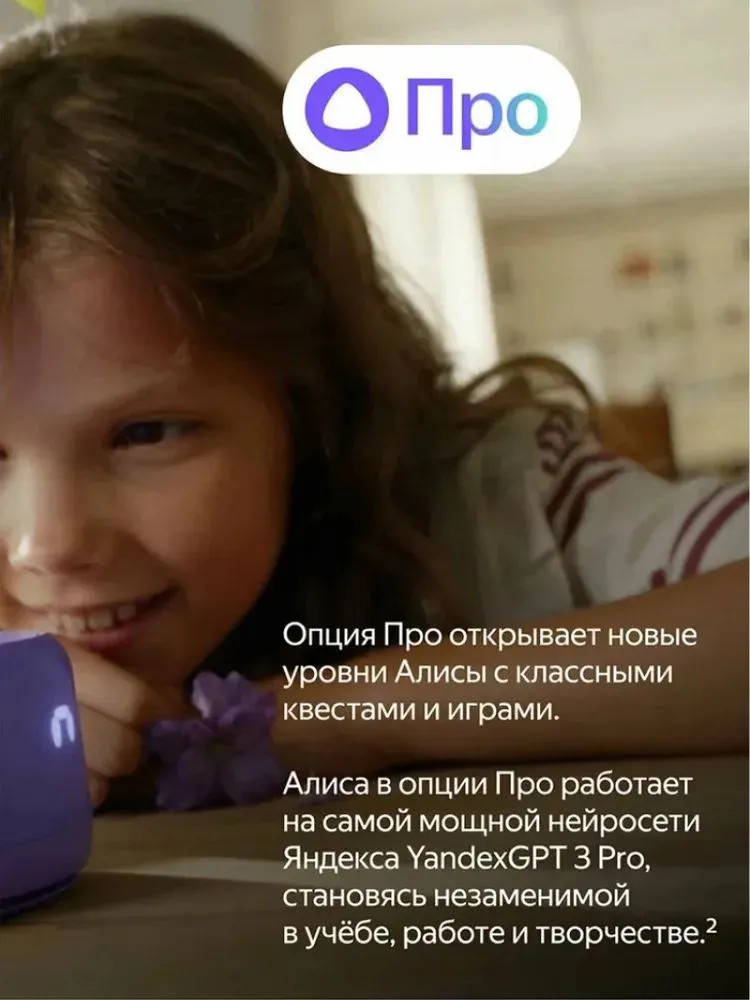 Алиса работает с нейросетью YandexGPT и всегда готова придумать самые смелые, весёлые и креативные идеи, объяснить сложное простыми словами и просто поддержать диалог. А если подключить опцию Алиса Про, у детей появится множество развивающих игр и квестов, а у родителей — возможность тратить больше свободного времени на себя.