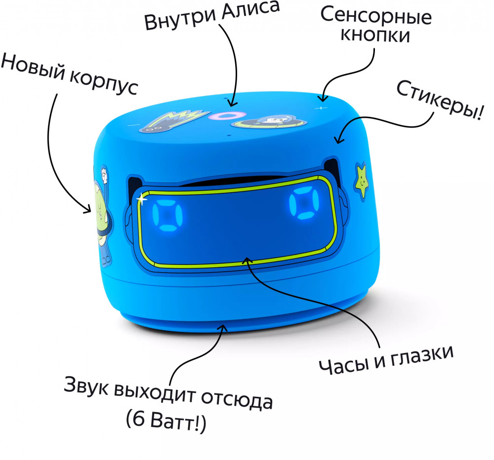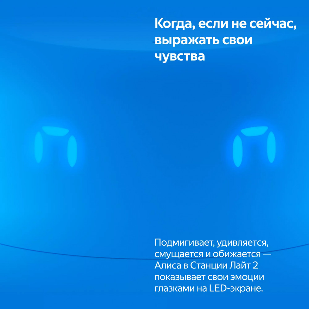 Яндекс станция Лайт 2 — новая умная колонка для детей и тех, кто не перестаёт ими быть. Внутри живёт более эмоциональная и функциональная Алиса, с которой никогда не бывает скучно: с ней можно веселиться, делиться секретами, играть и общаться дни напролёт — она найдет ответы на миллионы вопросов, придумает идеи, предложит классные игры, включит любимую музыку. Теперь виртуальный ассистент № 1 подстраивает интонацию под ваше настроение и показывает свои эмоции с помощью глазок на LED-экране станции. В наборе — классные стикеры и маски, чтобы у ребёнка было пространство для творчества.