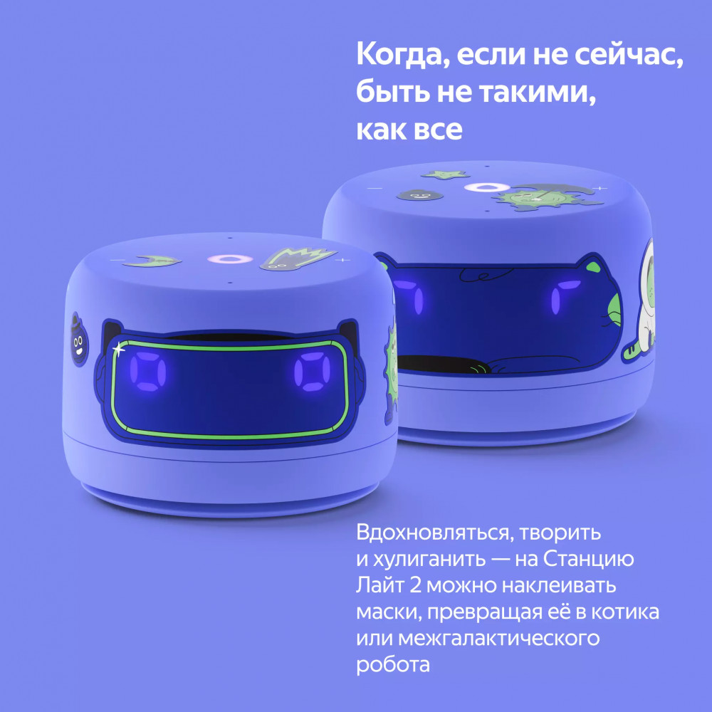 Со станцией Лайт 2 дети могут играть, хулиганить и превращать умную колонку в необычных персонажей. Например, можно наклеить на колонку маску котика или межгалактического робота. А стикерами из набора здорово украшать и умную колонку, и всё вокруг.