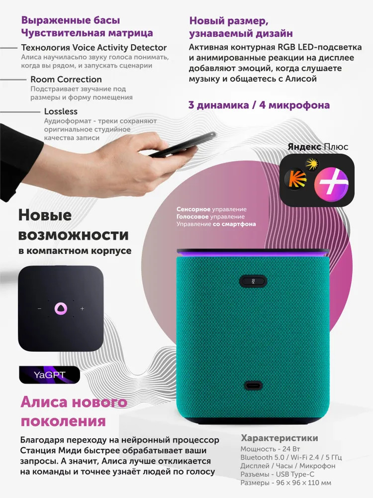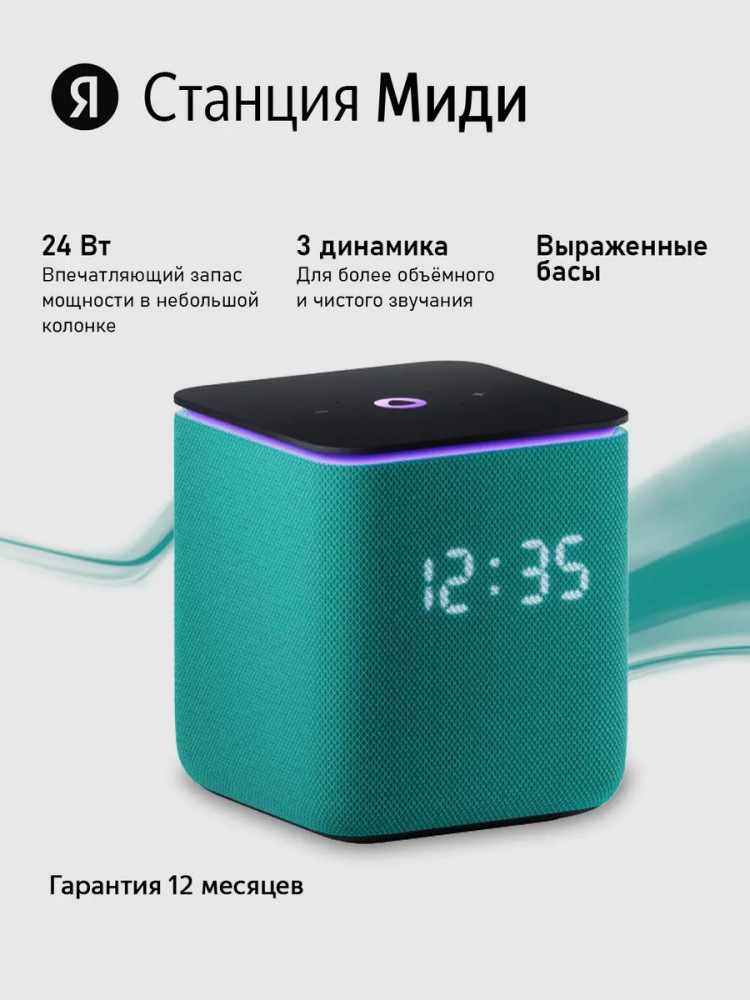 Яндекс станция Миди — новая умная колонка с виртуальным ассистентом Алисой. Мощное звучание 24 Вт в таком компактном корпусе. Нейронный процессор, благодаря которому Алиса ещё точнее отзывается на ваши команды и обрабатывает ваши запросы. LED-дисплей, который показывает время, погоду и реакции Алисы, а также активная контрурная LED-подсветка. Встроенный хаб управления Zigbee™1 и голосовое управление умным домом даже без интернета2. Беспроводная связь Wi-Fi (2,4–5 ГГц) и Bluetooth 5.0, с возможностью встраивания в экосистему умного дома. Новый размер и узнаваемый дизайн — станция Миди впишется