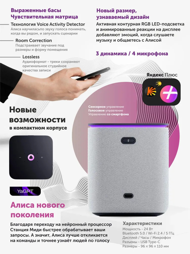 Яндекс станция Миди — новая умная колонка с виртуальным ассистентом Алисой. Мощное звучание 24 Вт в таком компактном корпусе. Нейронный процессор, благодаря которому Алиса ещё точнее отзывается на ваши команды и обрабатывает ваши запросы. LED-дисплей, который показывает время, погоду и реакции Алисы, а также активная контрурная LED-подсветка. Встроенный хаб управления Zigbee™1 и голосовое управление умным домом даже без интернета2. Беспроводная связь Wi-Fi (2,4–5 ГГц) и Bluetooth 5.0, с возможностью встраивания в экосистему умного дома. Новый размер и узнаваемый дизайн — станция Миди впишется