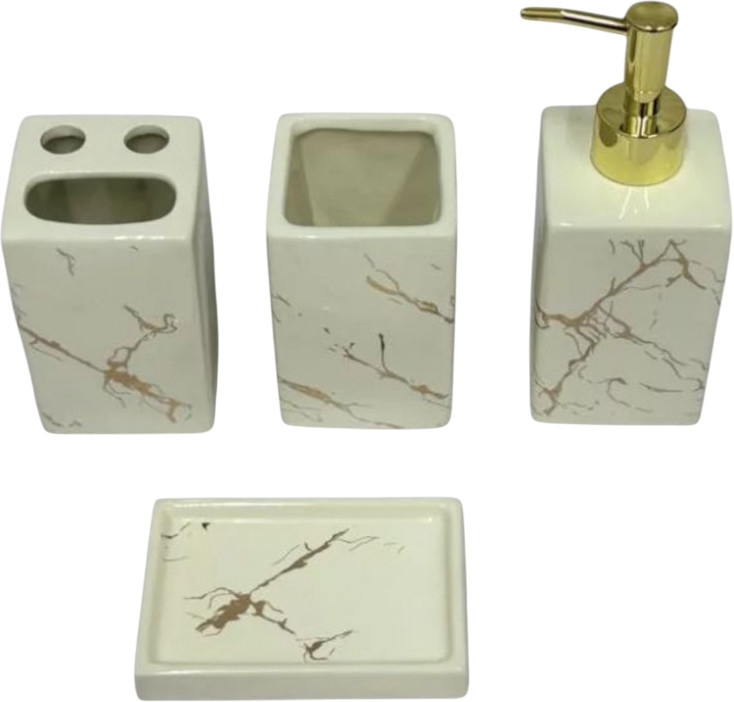 В данный момент этот товар отсутствует в продаже. Возможно, у нас найдется аналогичный или похожий товар здесь. Изысканный комплект позволит вам избавиться от визуального шума в интерьере, оформить душевую и туалет в едином дизайне. Органайзер для туалетных принадлежностей включает в себя четыре предмета — дозатор для жидкого мыла с удобным носиком, стакан для зубных щеток с разделителем на три отсека, стаканчик для пасты или полоскания, мыльница для твердого кускового мыла. Держатель с тремя отделениями возможно применить для расчески, мужской бритвы, косметики, туши или косметических карандашей.