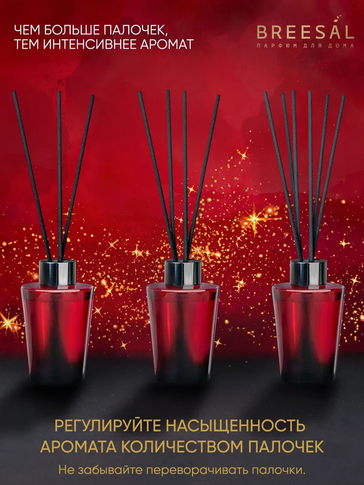 Черно-красный градиент флакона с элегантными черными палочками создает неповторимый визуальный образ, добавляя страсти и изысканности вашему интерьеру. Стильная упаковка бордового цвета с золотым тиснением выглядит роскошно и станет идеальным подарком как для нее, так и для него. Для производства диффузоров используются отдушки высокого качества из Европы от ведущих парфюмерных домов. Регулируйте интенсивность аромата, используя разное количество палочек: чем больше палочек вставлено в диффузор, тем сильнее и насыщеннее распространяется аромат. Стойкость аромата до 2 месяцев, в зависимости от размеров помещения и интенсивности использования. Откройте для себя всю коллекцию Breesal Passion и найдите свой идеальный аромат!