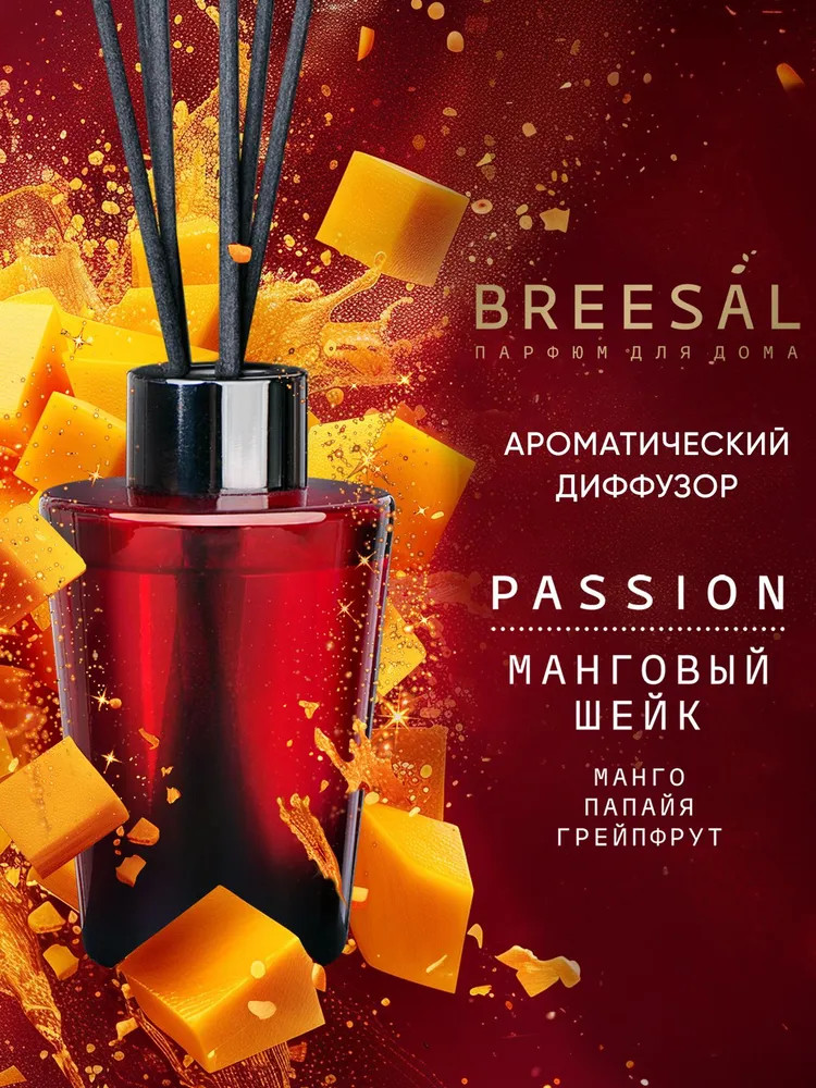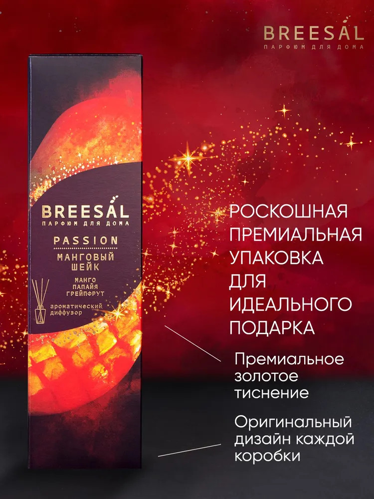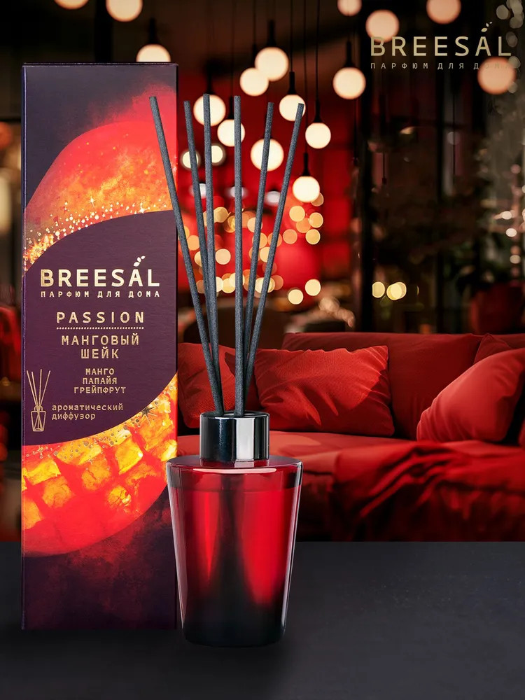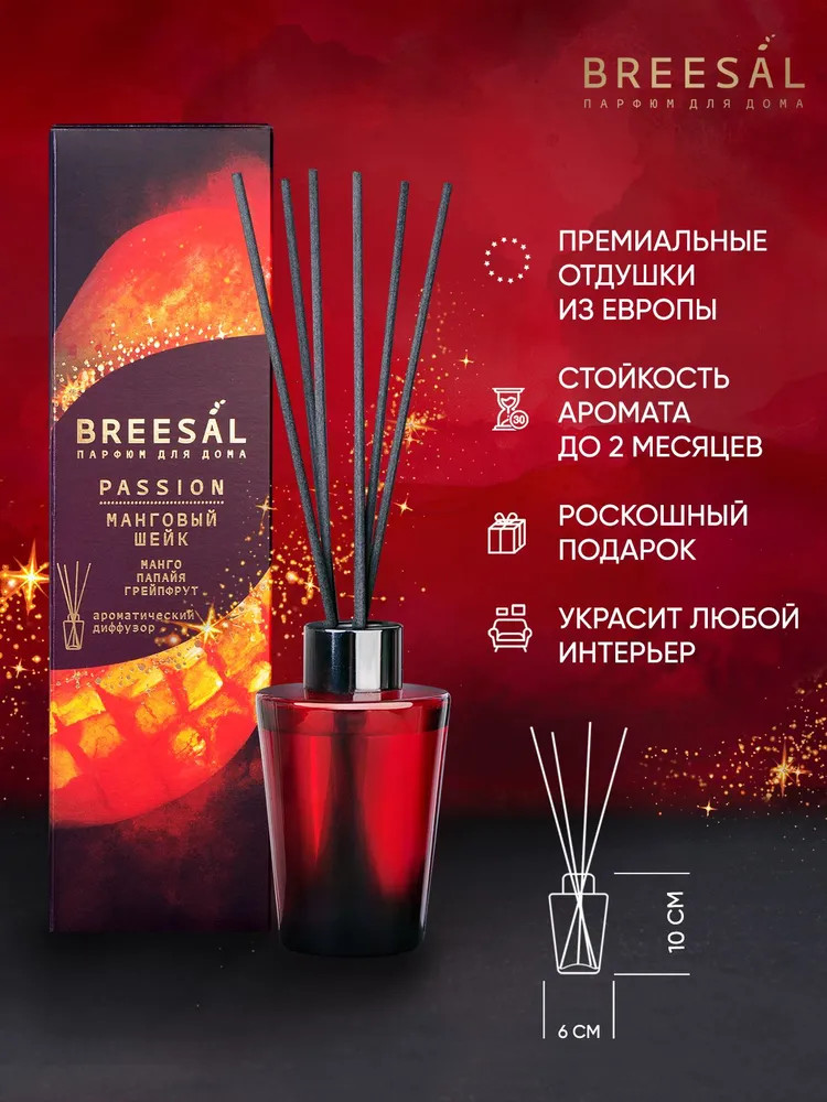 Черно-красный градиент флакона с элегантными черными палочками создает неповторимый визуальный образ, добавляя страсти и изысканности вашему интерьеру. Стильная упаковка бордового цвета с золотым тиснением выглядит роскошно и станет идеальным подарком как для нее, так и для него. Для производства диффузоров используются отдушки высокого качества из Европы от ведущих парфюмерных домов. Регулируйте интенсивность аромата, используя разное количество палочек: чем больше палочек вставлено в диффузор, тем сильнее и насыщеннее распространяется аромат. Стойкость аромата до 2 месяцев, в зависимости от размеров помещения и интенсивности использования. Откройте для себя всю коллекцию Breesal Passion и найдите свой идеальный аромат!