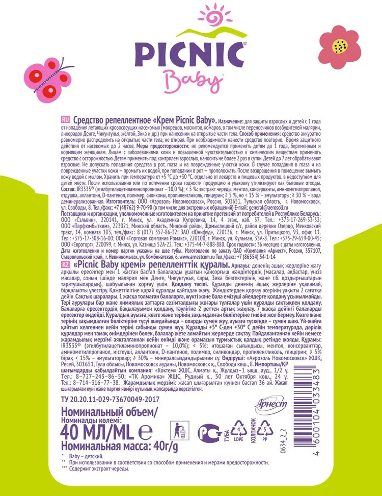 💳 Оплатить за товар можно при получении 🇰🇿 Есть бесплатная доставка по Казахстану от 1 дня 🎁 Копите бонусы с каждой покупки Серия: Baby Детский крем от комаров, москитов, мокрецов и других кровососущих насекомых Picnic Baby содержит самый безопасный, на сегодняшний день, репеллент IR3535. Это вещество не вызывает раздражения даже на самой чувствительной коже. Крем для детей Пикник против комаров действует 2 часа с момента нанесения. И его можно использовать для защиты детей от 1 года. Крем против кровососущих летающих насекомых наносят не более 2 раз детям до 3 лет и 3 раз — детям до 4 лет. Не использовать крем для защиты от комаров детей до 1 года, беременных и кормящих женщин. С осторожностью наносить на детскую кожу, особенно детям, предрасположенным к аллергии на лекарства и на химические средства. Для защиты одежды ребенка от комаров рекомендуется использовать аэрозоль против комаров и клещей. Крем защитит лишь открытые участки кожи. Также крем подходит взрослым, с очень чувствительной кожей, склонной к аллергическим реакциям. |