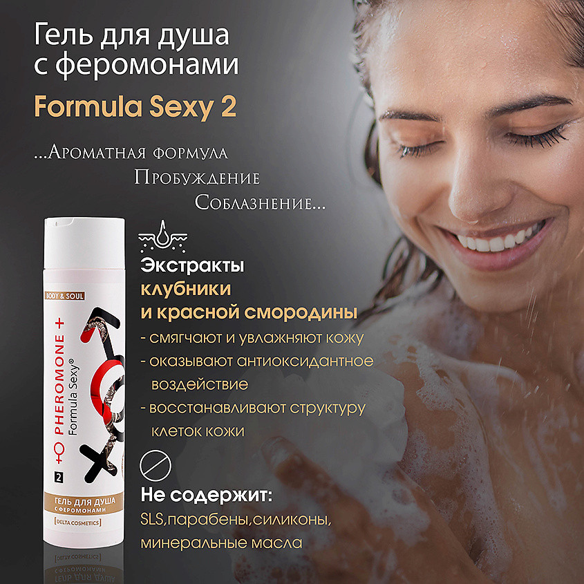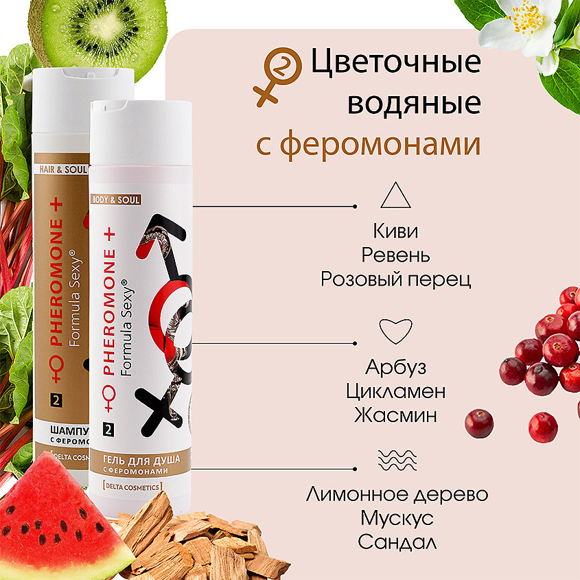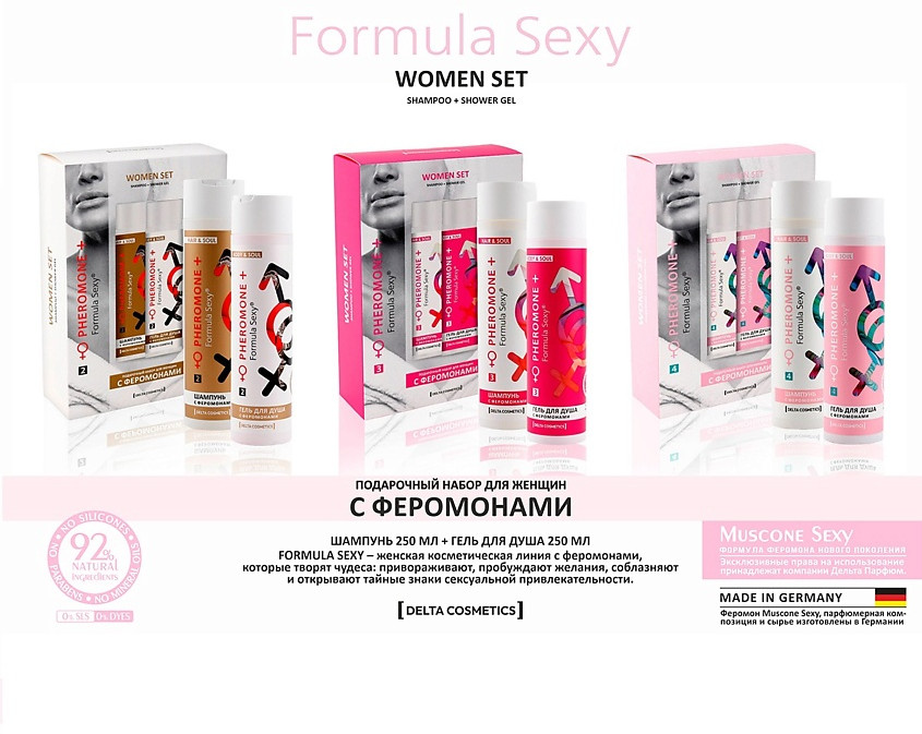 Formula Sexy® — эксклюзивная линия наборов с феромонами. Магическая формула шампуня способна раскрыть Вашу сексуальность и наполнить жизнь новыми яркими эмоциями, а экстракты клевера и шиповника в составе помогают снизить процесс выпадения волос, укрепляют луковицу, насыщают волосы кислородом, делая их блестящими и гладкими. Гель для душа с феромонами творит чудеса: привораживает, пробуждает желания и соблазняет. Нежная формула с аллантоином эффективно смягчает, увлажняет кожу, а экстракты клубники и красной смородины оказывает антиоксидантное воздействие, стимулирует синтез церамидов и восстанавливают структуру клеток кожи. Эти ароматные формулы, открывают тайные знаки Вашей сексуальности и придают Вам уверенности в себе. |