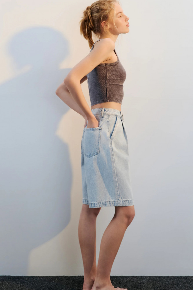 - Женские джинсовые шорты широкого кроя из мягкого и приятного к телу хлопкового денима с добавлением вискозы - Комфортная высокая посадка подчеркивает фигуру и скрывает недостатки. Короткие широкие штанины выше колена со складками на поясе. Застежка на молнию и пуговицу спереди, шлевки для ремня. Два боковых кармана с отрезным бочком, два накладных кармана сзади - Стильные и удобные широкие джортсы идеально сочетаются с любым комфортным тебе верхом и составят отличную основу гардероба на лето. Сочетай эти джинсовые бермуды с костюмной жилеткой на голое тело. Или с джинсовым верхом, создавая тотал-денимные луки. Универсальные и практичные джинсовые шорты, с которыми можно составить несчетное количество аутфитов в любом стиле и под любое настроение