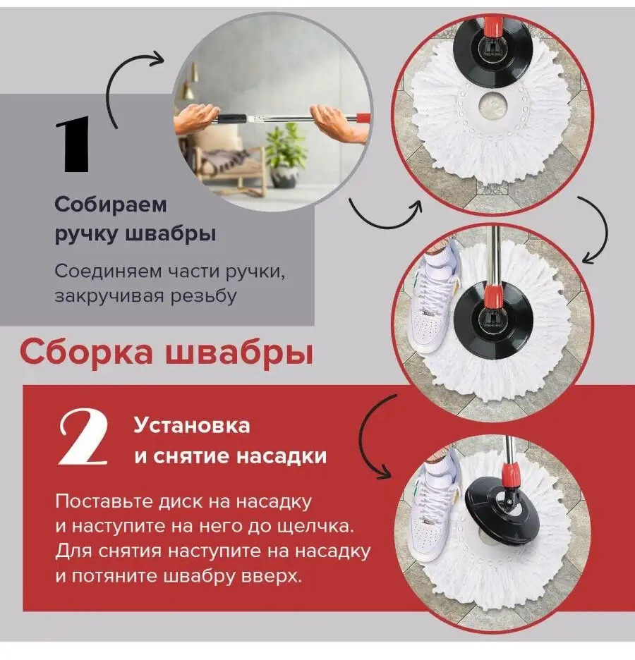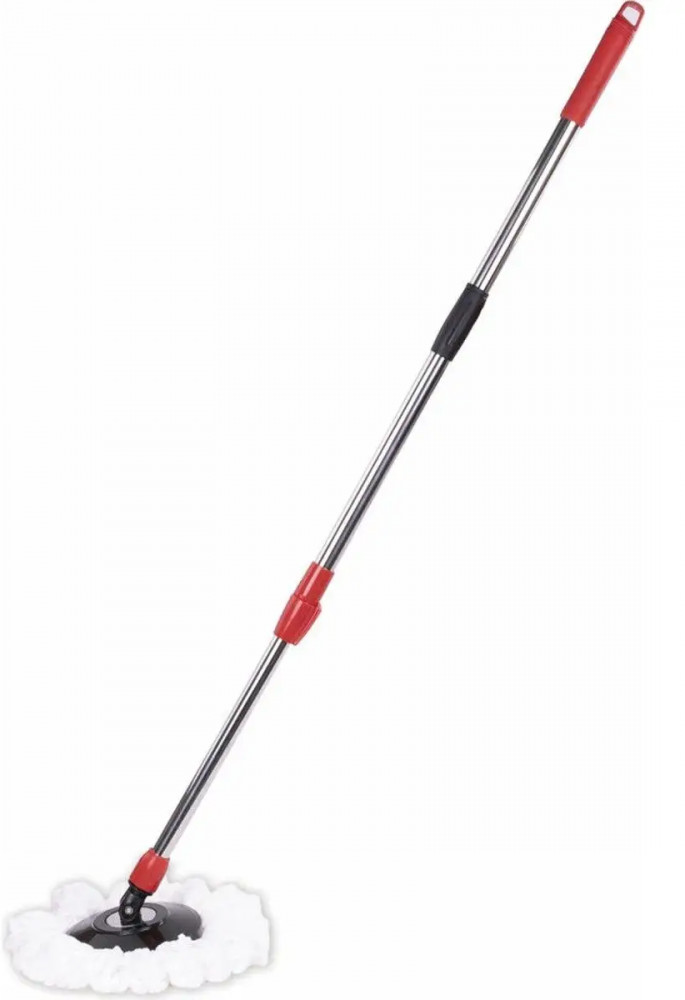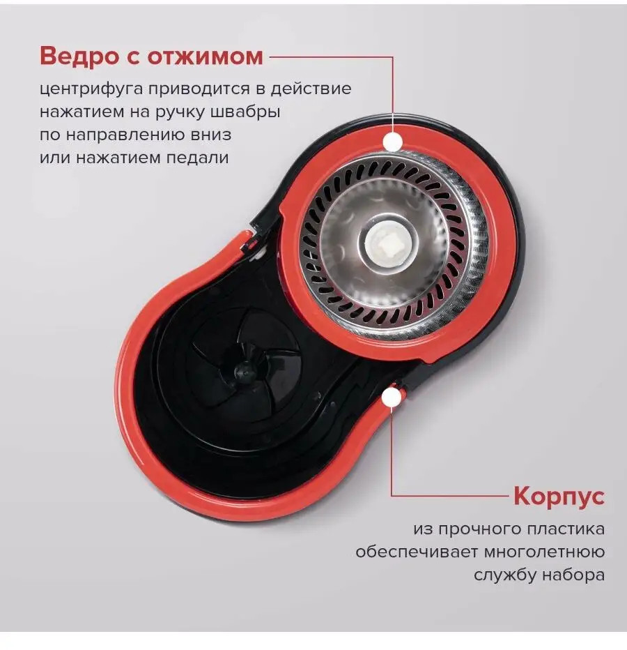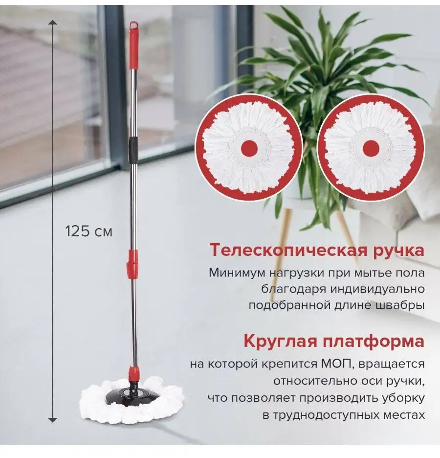 Надежный металлический корпус отжима-центрифуги (отличительная особенность от пластиковых корпусов аналогов, которые быстро выходят из строя). Отжим осуществляется нажатием ручки по направлению вниз. Круглая платформа, на которой крепится МОП, вращается относительно оси ручки, что позволяет производить уборку в труднодоступных местах (например, под мебелью). Отжим-центрифуга, приводящаяся в действие нажатием на ручку швабры. Объем ведра из пластика — 7/5 л. Рукоятка телескопическая, позволяет подобрать наиболее удобную длину. Моющий элемент МОПа из микрофибры чистит без моющих средств.
