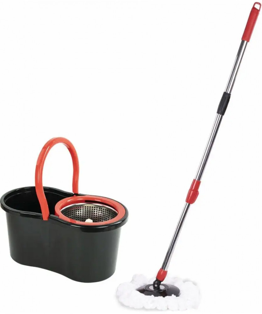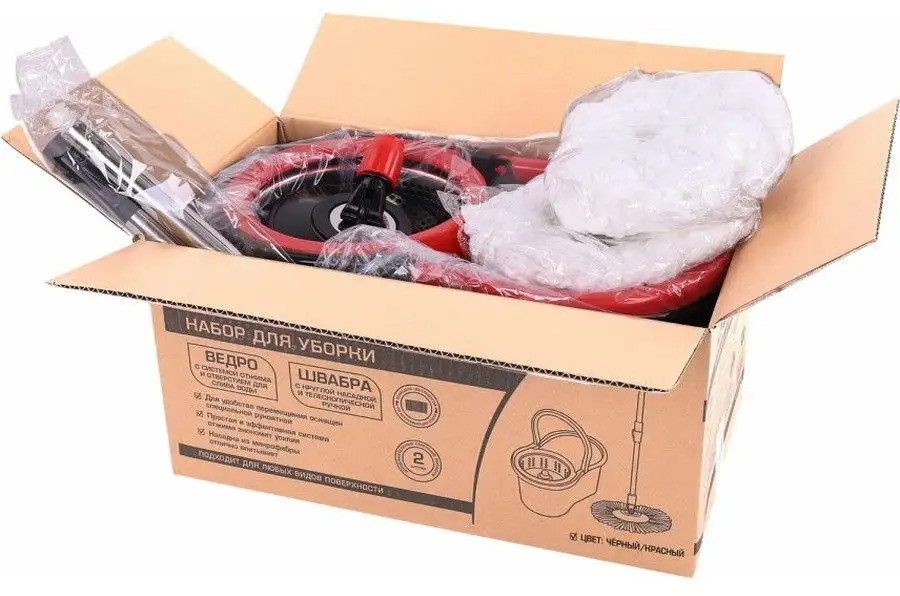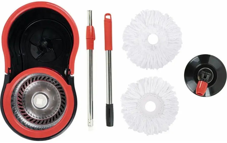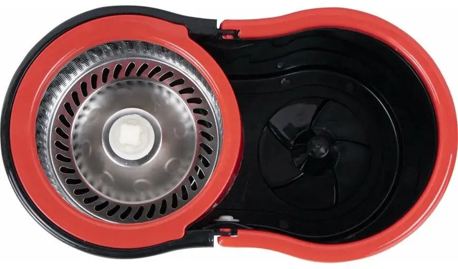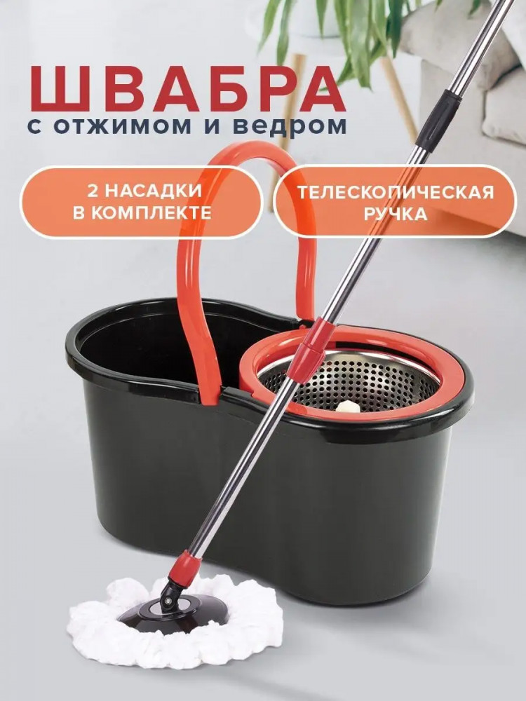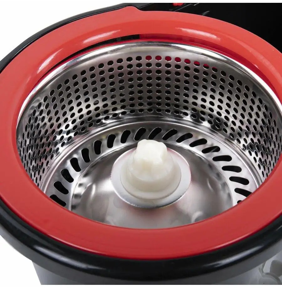 Надежный металлический корпус отжима-центрифуги (отличительная особенность от пластиковых корпусов аналогов, которые быстро выходят из строя). Отжим осуществляется нажатием ручки по направлению вниз. Круглая платформа, на которой крепится МОП, вращается относительно оси ручки, что позволяет производить уборку в труднодоступных местах (например, под мебелью). Отжим-центрифуга, приводящаяся в действие нажатием на ручку швабры. Объем ведра из пластика — 7/5 л. Рукоятка телескопическая, позволяет подобрать наиболее удобную длину. Моющий элемент МОПа из микрофибры чистит без моющих средств.