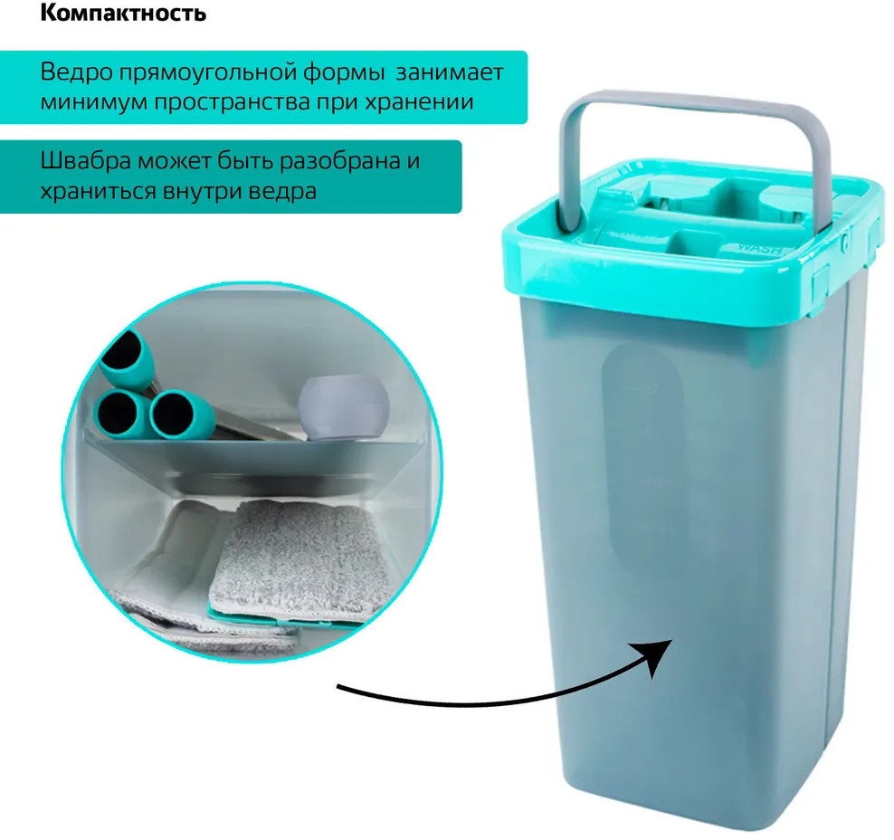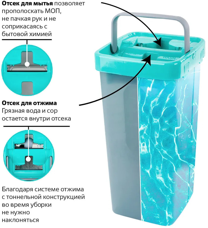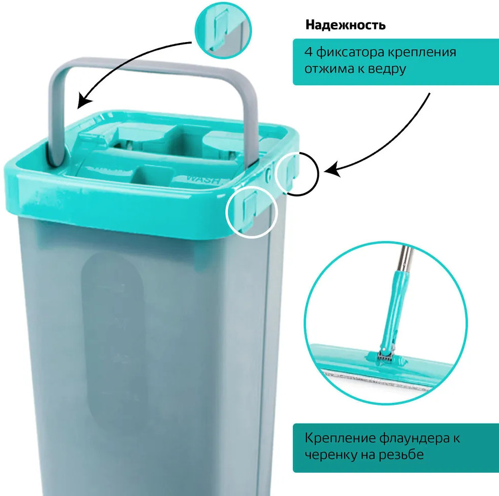 Набор состоит из прямоугольного ведра с двумя отсеками (первый отсек с чистой водой, второй отсек с туннельным отжимом для отжима МОПа и сбора мусора / грязной воды). Отжим МОПа происходит посредством плотного прижатия флаундера в корпусе туннельного отжима. Для удобства хранения швабру можно разобрать на части и аккуратно сложить все элементы в ведро (см. фото).