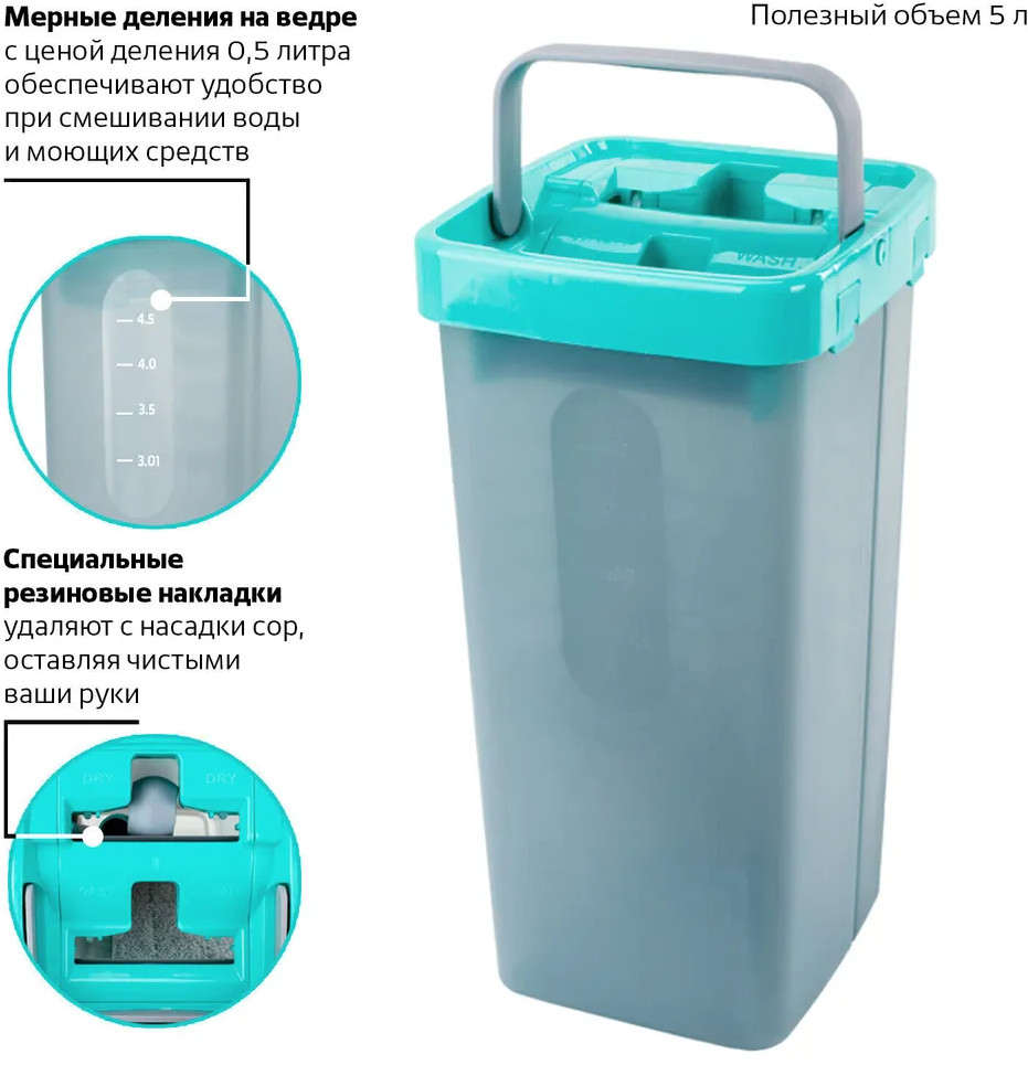 Общий объем — 9 литров, полезный объем — 7 литров: одна часть имеет объем 5,5 литра, полезный — 4,5 литра (в этой части осуществляется споласкивание, и мерная шкала нужна для смешивания растворов для мытья поверхностей). Вторая часть — 3,5 литра, полезный объем — 2,5 литра (в этой части осуществляется отжим МОПа и сбор грязной воды).