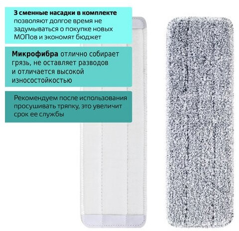 Данный набор для уборки уникален своей компактностью и при этом очень функционален. Уникальность данного набора для уборки состоит и в том, что за счет трех составных частей черенка он становится универсальным: максимальная длина черенка равна 130 см, но если убрать одну часть, то длина становится 100 см. В комплекте идут 3 сменные насадки, которых хватит на долгое время использования. Также их можно применять для уборки разных комнат. Одна из двух частей ведра имеет мерные деления 3,0-4,5 литра с ценой деления 0,5 литра.