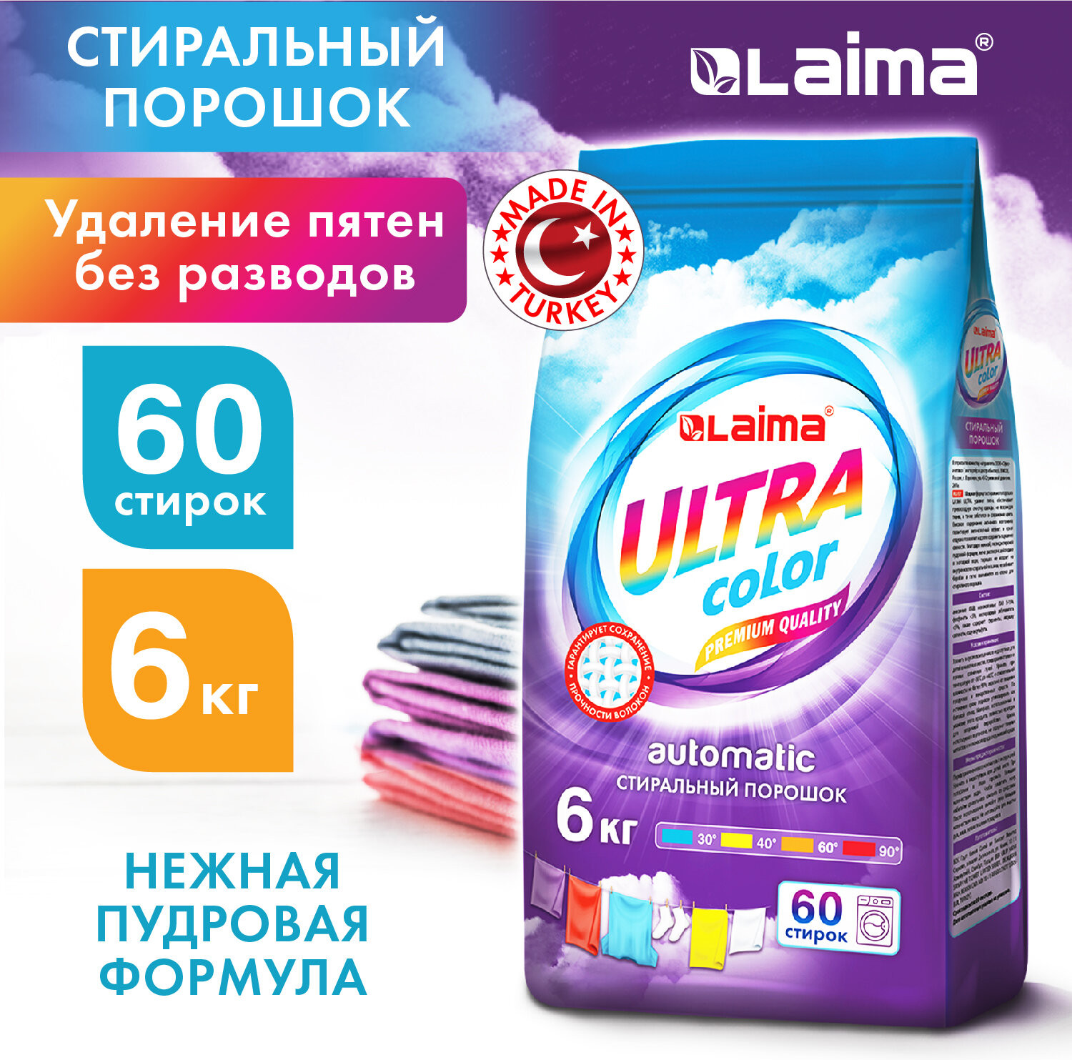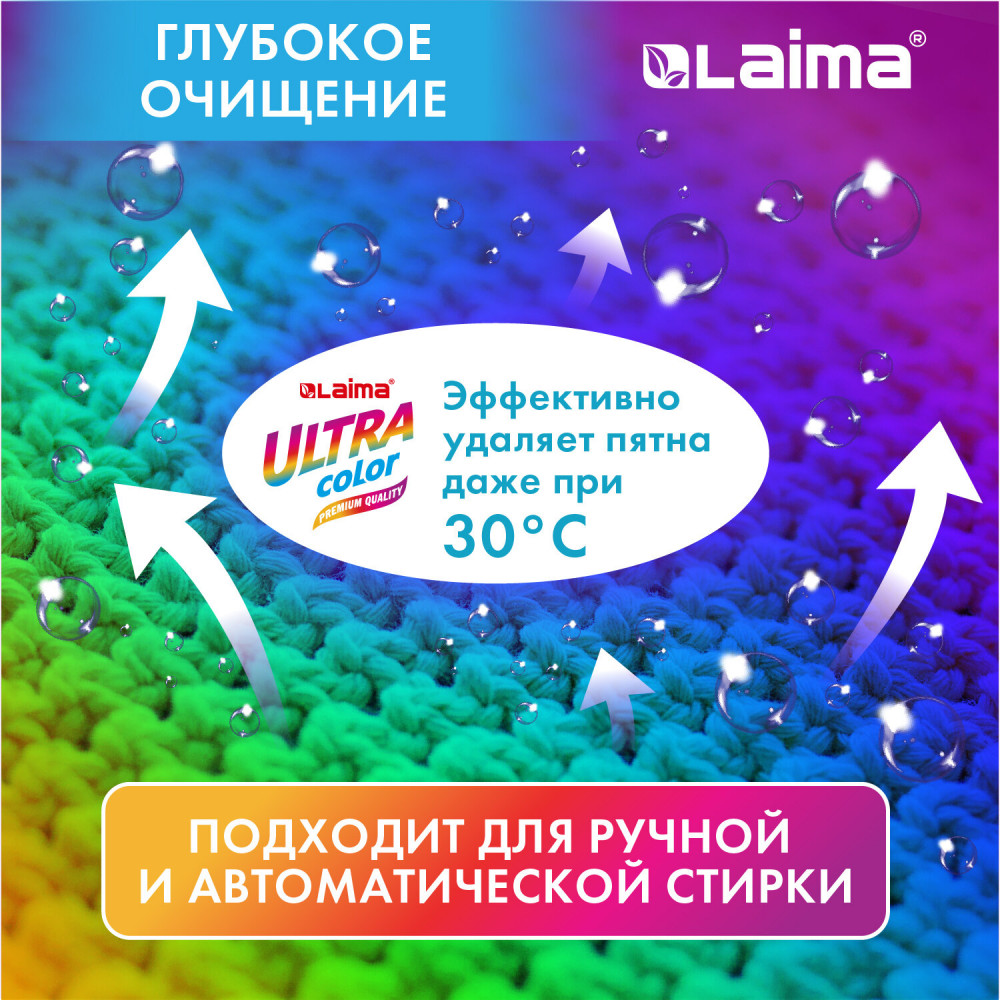 Мощная формула стирального порошка Laima Ultra Color удаляет пятна, обеспечивает превосходную очистку одежды, не повреждая ткани, а также обеспечивает защиту цвета. Высокое содержание активного компонента гарантирует великолепный эффект, а яркая отдушка позволяет надолго сохранить ощущение свежести. Благодаря нежной, мелкодисперсной пудровой формуле, легко растворяющейся даже в холодной воде, порошок не оседает на внутренностях стиральной машины, не забивает барабан и легко вымывается из отсека для стирального порошка. Назначение: для всех видов тканей, кроме шерсти и шелка. Стиральный порошок Laima Ultra Color — это уникальная формула и великолепная эффективность! С ним ваша стирка станет лёгкой!