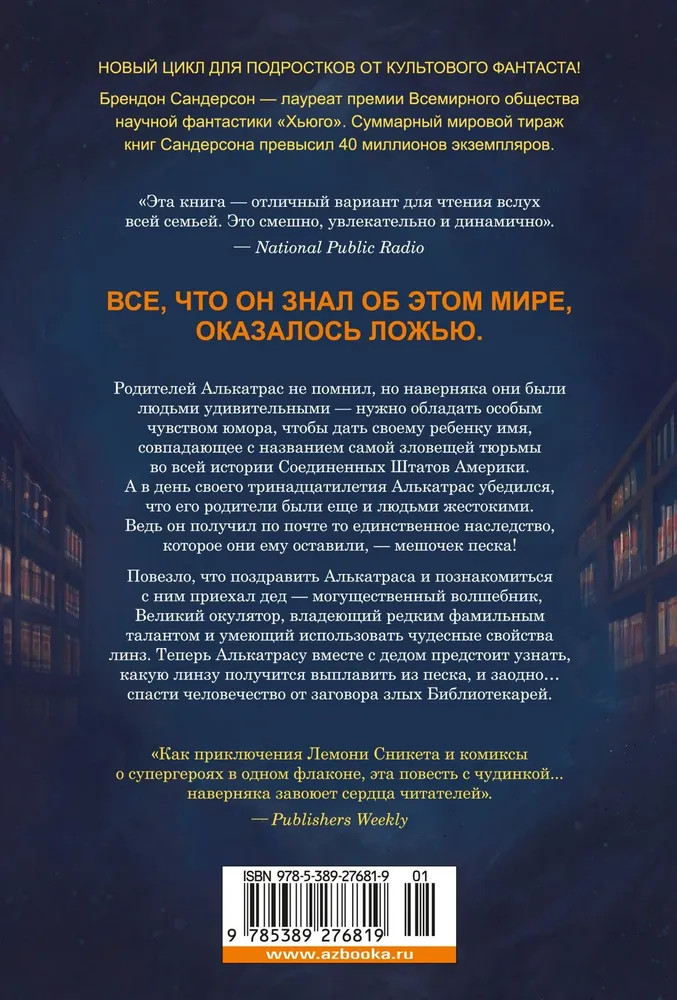 💳 Оплатить за товар можно при получении 🇰🇿 Есть бесплатная доставка по Казахстану от 1 дня 🎁 Копите бонусы с каждой покупки Серия: Приключения Алькатраса «Алькатрас против злых Библиотекарей» — первая книга цикла «Алькатрас» для подростков от знаменитого автора бестселлеров Брендона Сандерсона! Захватывающее фэнтези перевела прославленный писатель и переводчик Мария Семенова. Родителей Алькатрас не помнил, но наверняка они были людьми удивительными — нужно обладать особым чувством юмора, чтобы дать своему ребенку имя, совпадающее с названием самой зловещей тюрьмы во всей истории Соединенных Штатов Америки. А в день своего тринадцатилетия Алькатрас убедился, что его родители были еще и людьми жестокими. Ведь он получил по почте то единственное наследство, что они ему оставили, — мешочек песка! Повезло, что поздравить Алькатраса и познакомиться с ним приехал дед — могущественный волшебник, Великий Окулятор, владеющий редким фамильным Талантом и умеющий использовать чудесные свойства Линз. Теперь Алькатрасу вместе с дедом предстоит узнать, какую Линзу получится выплавить из песка, и заодно... спасти человечество от заговора злых Библиотекарей. Эта книга станет замечательным подарком для детей: на каникулах легко нырнуть в волшебный мир с головой и забыть про уроки и экзамены! А иллюстрации Хэйли Лазо сделают это погружение еще более объемным. |
