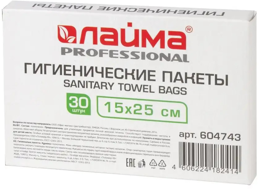 💳 Оплатить за товар можно при получении 🇰🇿 Есть бесплатная доставка по Казахстану от 1 дня 🎁 Копите бонусы с каждой покупки Серия: Professional Гигиенические пакеты Laima используются для удобства утилизации гигиенических отходов. Применяются в туалетных комнатах, возможно использование с помощью диспенсера или из удобной картонной упаковки с отборочным клапаном. Изготовлены из полиэтилена толщиной 10 мкм. Цвет — белый. Ёмкость 2 л. Можно использовать в диспенсерах, совместимых с диспенсерной системой B5. Помогают поддерживать гигиену на высоком уровне. Способствуют устранению неприятного запаха. Поставляются в количестве 30 штук в индивидуальной картонной упаковке с отборочным клапаном. |