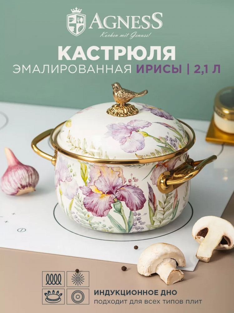 Серия: Irises Бренд Agness в международном сотрудничестве с европейскими производителями представляет серию «Irises». Линейка данных товаров сочетает в себе ряд преимуществ: яркий стильный дизайн, технологичность и практичность в использовании. Серия представлена широким ассортиментом товаров: чайники, кастрюли, банки для сыпучий продуктов, тортовницы, сахарницы и многое другое украсят вашу кухню.