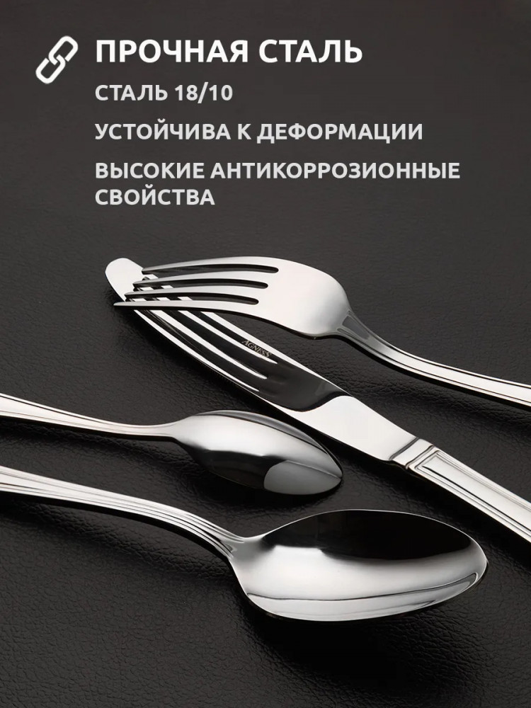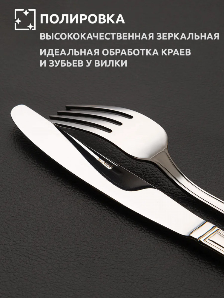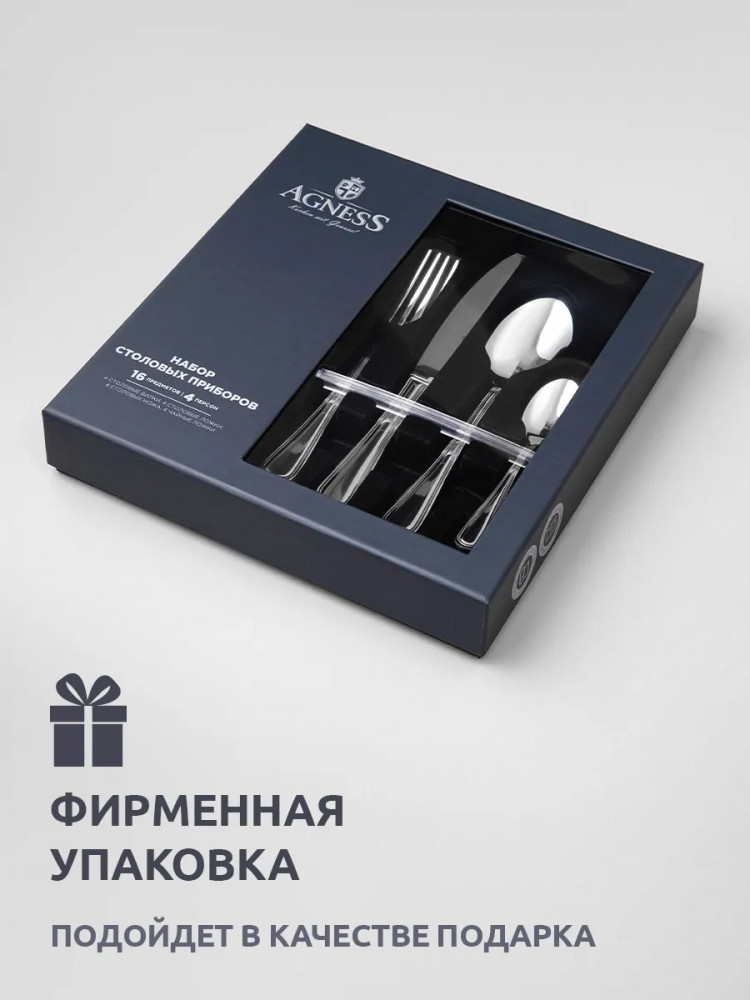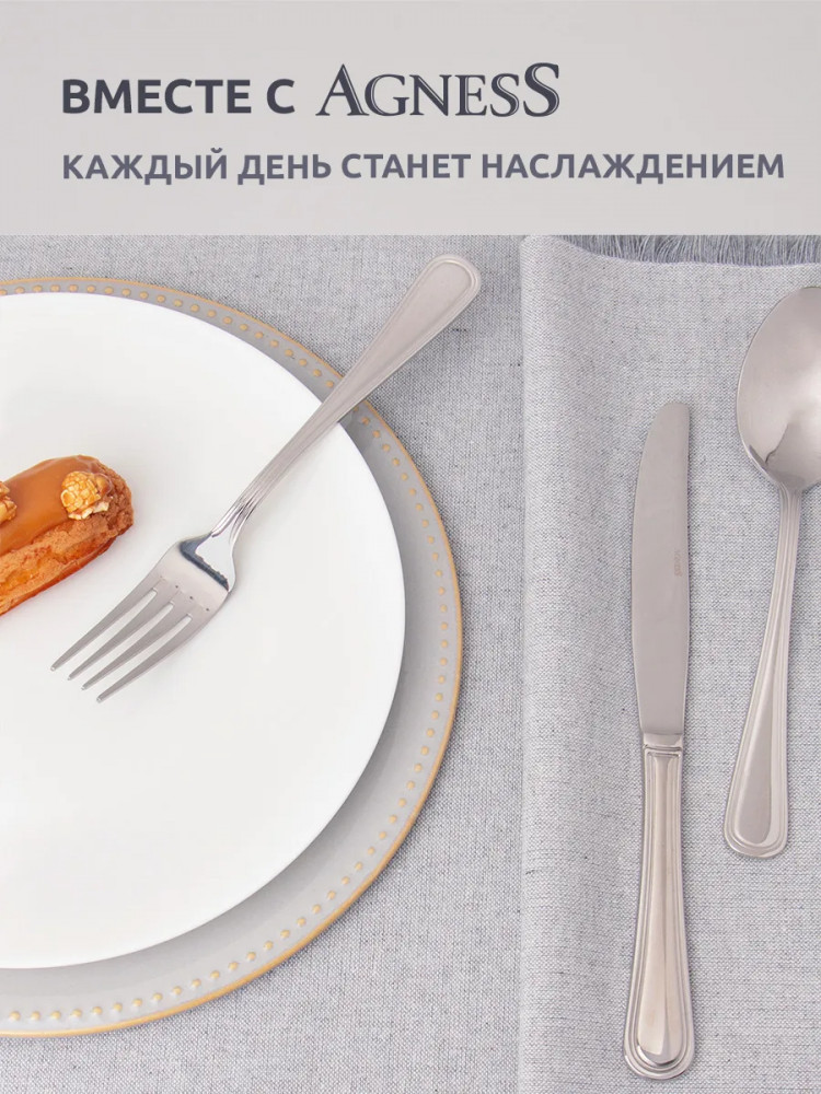 Набор столовых приборов Agness не только прекрасно выглядят, но и обладают отличной функциональностью. Вилки и ложки имеют комфортные ручки, которые удобно держать в руке. Каждый предмет выполнен из нержавеющей стали, что обеспечивает долговечность и устойчивость к коррозии. Набор столовых приборов является отличным выбором для кухни, где они могут быть использованы в повседневной жизни или во время особых событий и праздников. Они также подходят для ресторанов и кафе, добавляя шарма и элегантности к сервировке стола. Благодаря своей прочности и изысканному дизайну, этот набор столовых приборов станет вашим надежным и стильным спутником на многие годы.Чтобы приборы прослужили долго необходимо соблюдать ряд правил по уходу: использовать мягкие материалы, щадящие моющие эко вещества, замачивать застарелые пятна, исключая механическое воздействие. Запрещается использовать абразивные и хлоросодержащие средства.