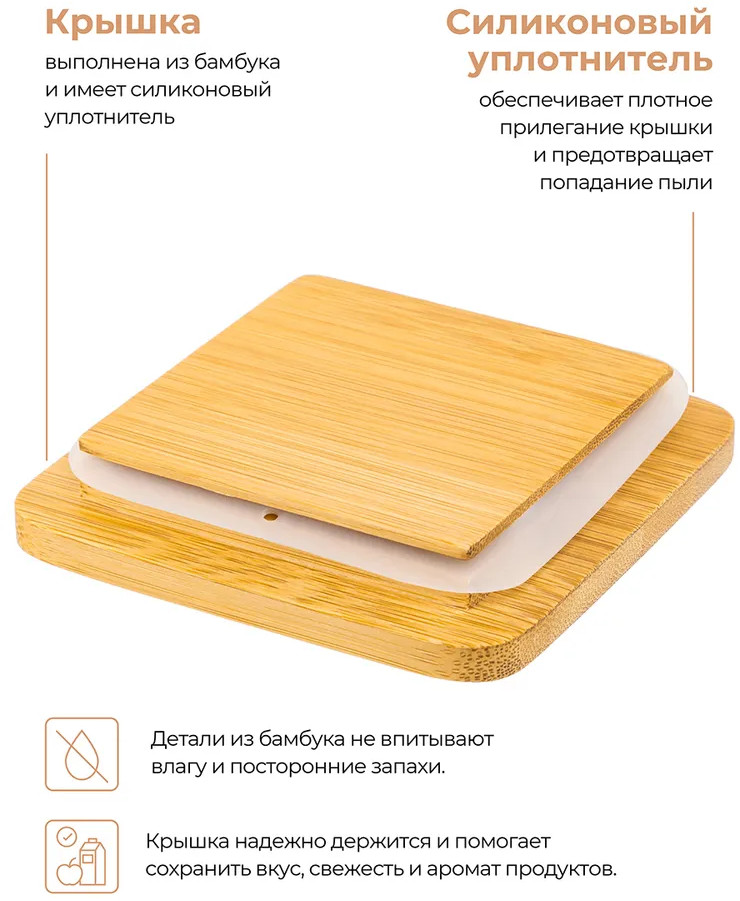 Внимание! Не рекомендуется применять абразивные моющие средства. Не подходит для использования в микроволновой печи. Без бамбуковой крышки подходит для посудомоечной машины. Бамбук нельзя замачивать!