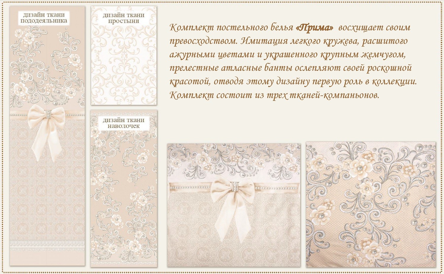 • использование трех тканей компаньонов в рисунках Богема, Прима и Визави: для пододеяльника, простыни и наволочек;