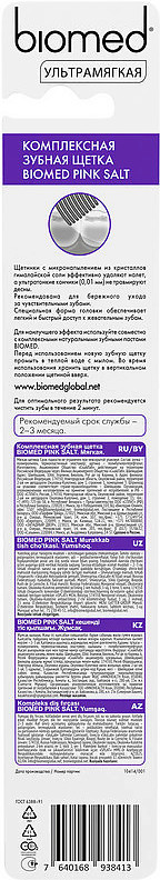 Зубная щетка Biomed Pink Soft — биоинновация для здоровья и красоты вашей улыбки. Разработана для бережной чистки чувствительных зубов и десен. Напыление из розовой гималайской соли на ее 2024 мягких и тонких заостренных щетинках помогает нейтрализовать кислый pH в полости рта, тем самым снижая риск развития кариеса. Богатая минералами и микроэлементами розовая гималайская соль оказывает мягкое антибактериальное действие, укрепляет эмаль и оздоравливает десны. Уникальная уплотненная щетина Biomed Pink Soft не имеет соленого привкуса. Она эффективно и безопасно удаляет налет, бережно массирует десны, оставляя приятное ощущение чистоты во рту. Товар находится в ассортименте без возможности выбора.