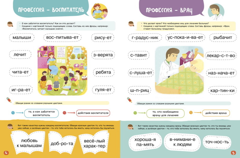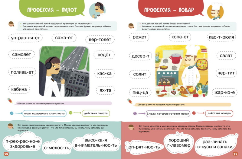 • Каждый разворот книги содержит описание профессии и задания на сообразительность. Графическое задание для ребёнка направлено на многократное прочтение слов, уточнение смысла каждого из них, поиск и составление профессионального словарика.