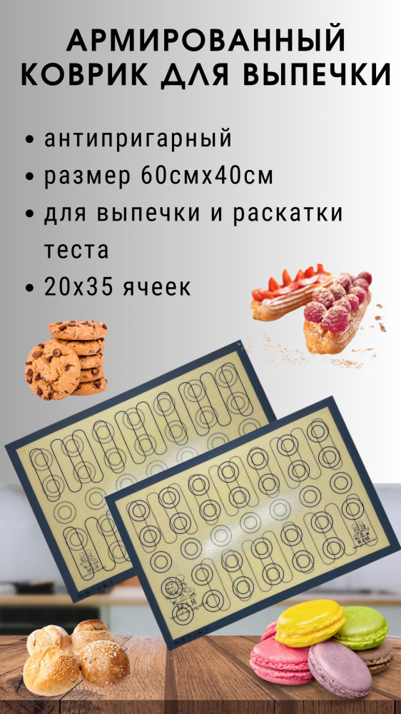 В данный момент этот товар отсутствует в продаже. Возможно, у нас найдется аналогичный или похожий товар здесь. Коврик для выпечки изготовлен из силикона и армирован стеклотканью, благодаря чему тепло равномерно распределяется по всей поверхности коврика.коврик для выпечки имеет разметку в виде кружков, что позволяет приготовить всеми любимые макарон.