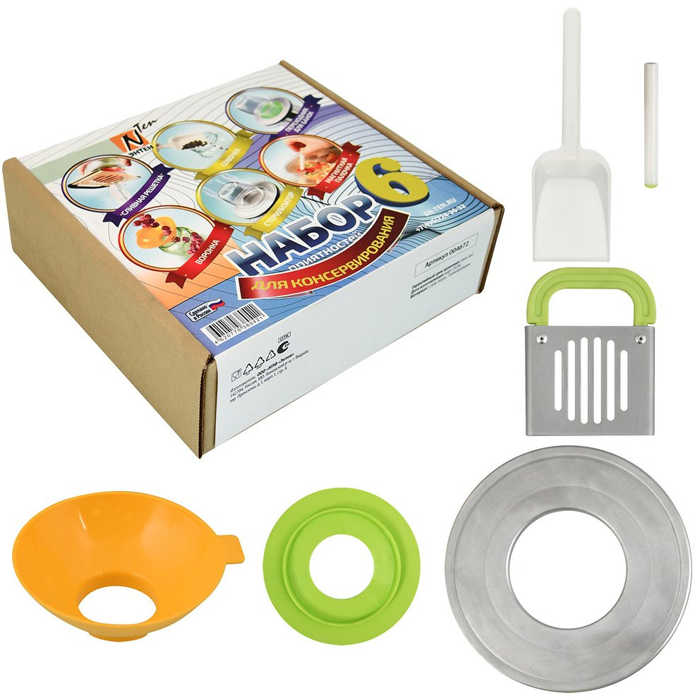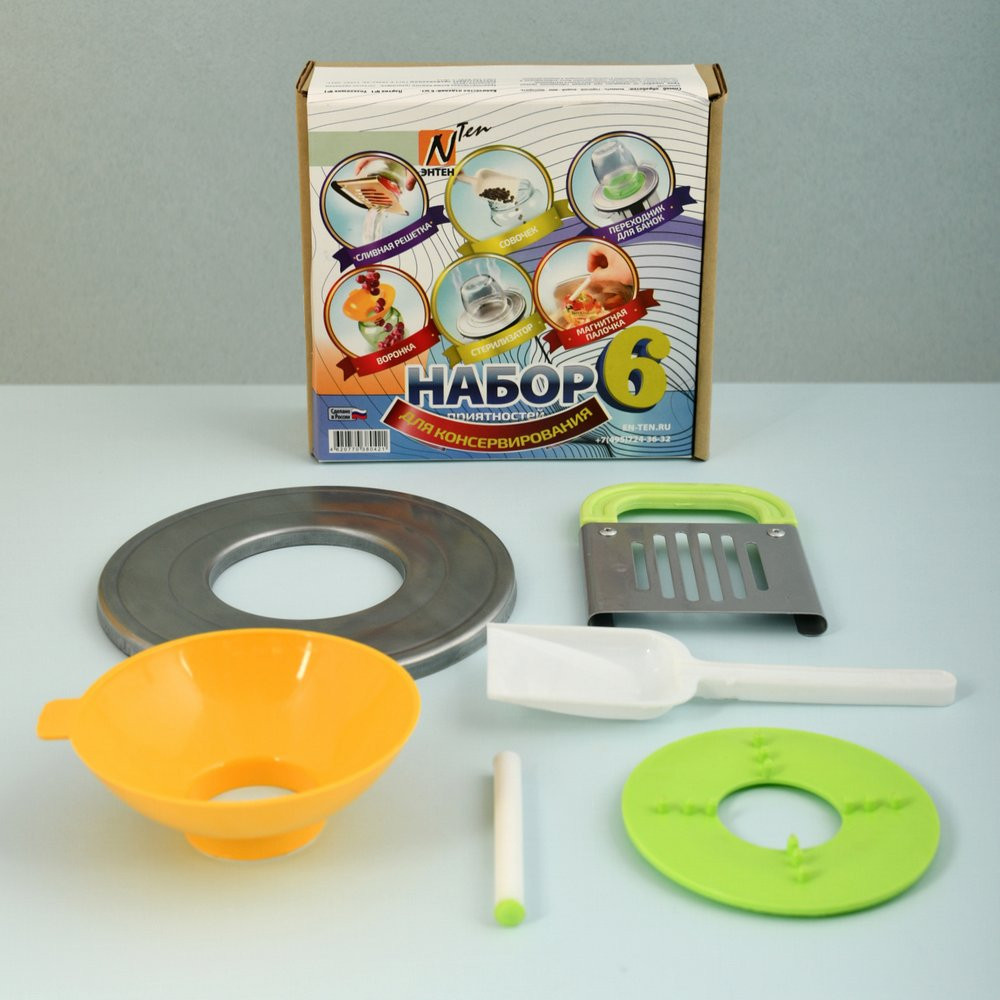 ЭНТЕН Набор для консервированияВ данный момент этот товар отсутствует в продаже. Возможно, у нас найдется аналогичный или похожий товар здесь. В набор для консервирования входят полезные кухонные приспособления, которые облегчают приготовление домашних заготовок. Стерилизатор применяется для паровой обработки стеклянных банок. Его можно использовать отдельно либо вместе с переходником, если нужно простерилизовать емкости с более узкой горловиной. Совок облегчит распределение сыпучих продуктов по банкам, а воронка с широким горлом поможет не пролить ни капли при разливании сиропов, маринадов, рассолов и прочих жидкостей. Решетка для слива позволит без труда слить рассол или маринад, не давая содержимому выпасть из банки. В набор для консервирования также входит магнитная палочка, благодаря которой можно безопасно, не боясь обжечься, доставать из кипятка стерилизованные металлические крышки. С таким набором для консервирования, приготовление компотов, салатов и прочих заготовок на зиму превратится в легкий и увлекательный процесс. |