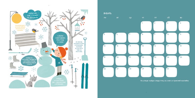 Чтобы каждый месяц нового года стал особенным и незабываемым, выполняйте задания, которые найдёте на картинках. Их можно делать дома, на улице и на страницах календаря. В удобной календарной сетке можно вести краткий дневник, записывая самые яркие моменты прошедшего дня. |