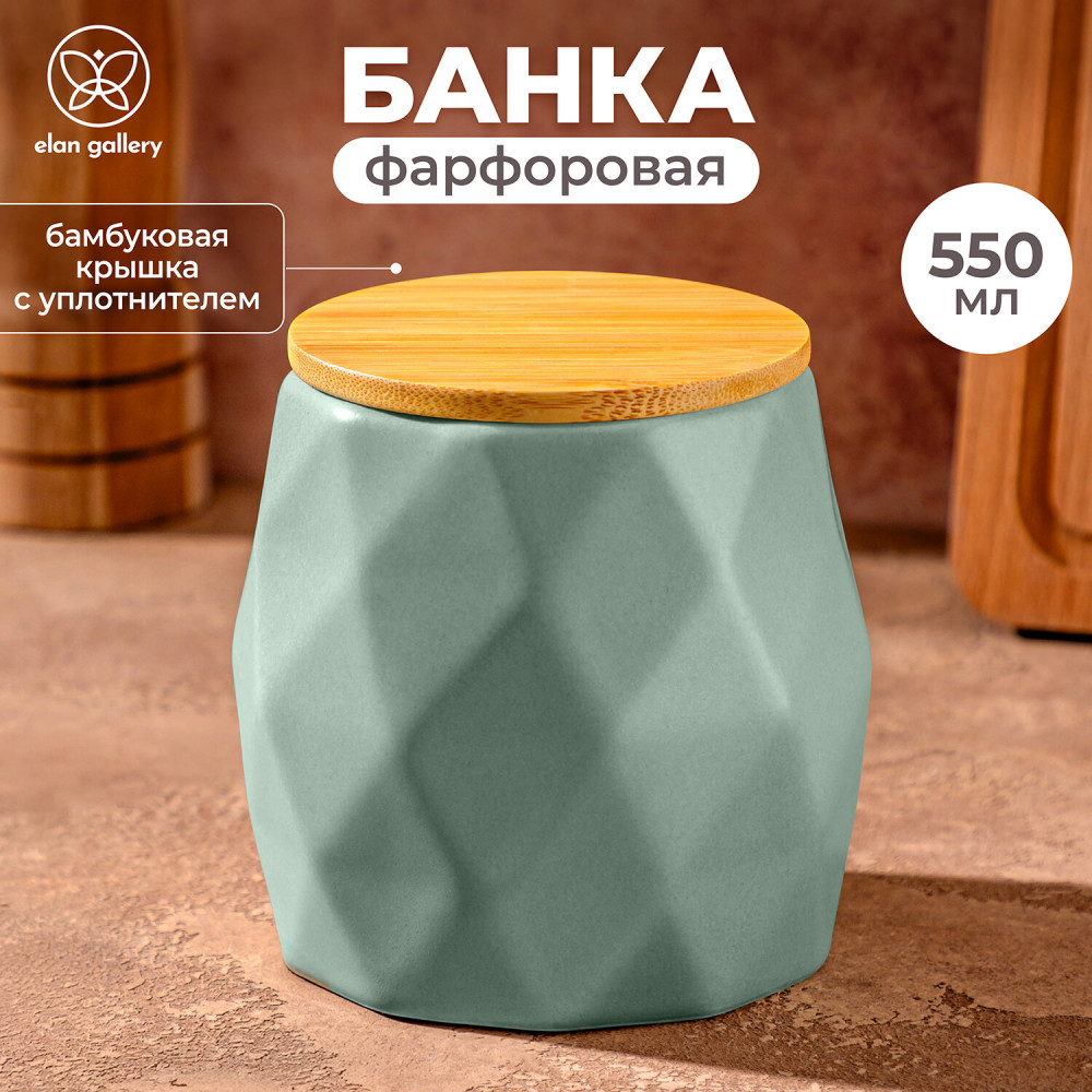 Банка от Elan Gallery предназначена для организации хранения продуктов на вашей кухне. Выполнена из высококачественного белого фарфора. Он не впитывает цвет продуктов и легко отмывается, благодаря чему надолго сохранит свой привлекательный вид. Поверхность имеет необычный гранёный рельеф. Крышка выполнена из натурального бамбука и оснащена силиконовым уплотнителем. Изделие отлично подойдёт для хранения сыпучих продуктов: сахара и соли, чая и кофе, приправ и специй. Храните в баночке ягоды, орехи и сухофрукты. Заполните её леденцами, конфетами или небольшим печеньем. Подайте баночку к столу, чтобы идеально дополнить чайную сервировку! Герметичная деревянная крышка защитит ваши продукты от попадания грязи и пыли.