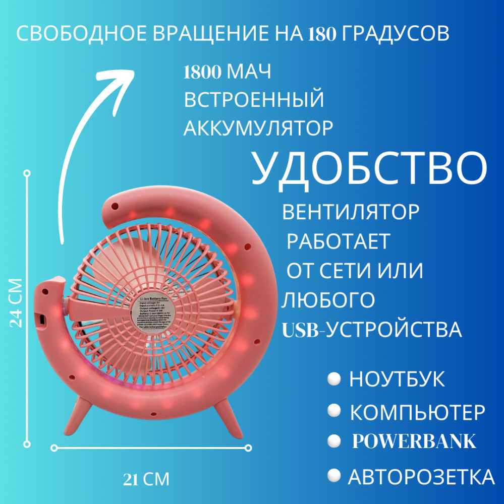 Независимо от того, хотите ли вы легкий освежающий ветерок или мощный поток воздуха, наш вентилятор справится с задачей. И самое главное — его бесшумная работа позволит вам наслаждаться прохладой даже в ночное время, не беспокоясь о шуме. Охладитель вращается на 180 градусов, что позволяет направить поток воздуха именно туда, где он вам нужен. Просто поверните его в нужном направлении, и наслаждайтесь комфортом! Портативный вентилятор имеет разборную конструкцию, что делает его легким в уходе и хранении, а установка займет всего 2 минуты.